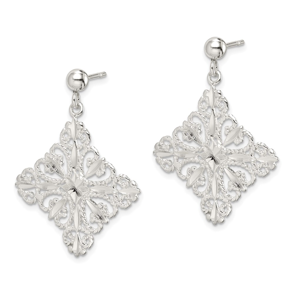 Sterling Silver Polished & Diamond-cut Filigree Square Post Dangle Earrings