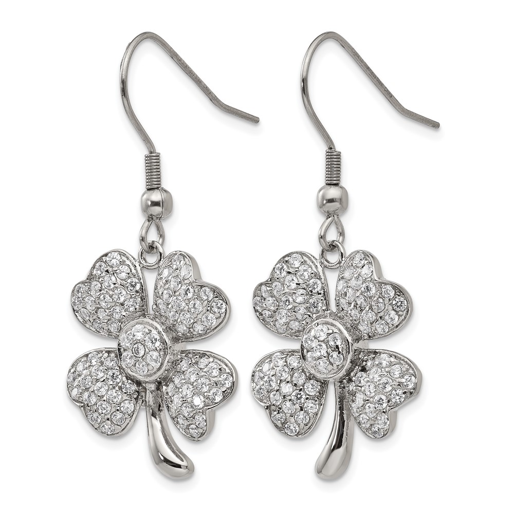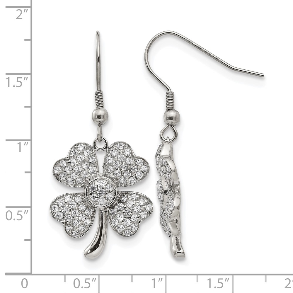 Chisel Stainless Steel Polished with CZ 4-Leaf Clover Dangle Shepherd Hook Earrings