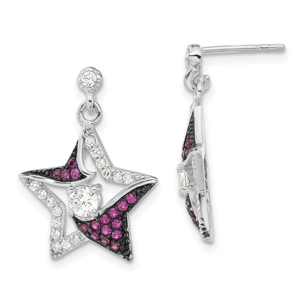 Sterling Silver w/ Black Rhodium Syn. Ruby & CZ Star Post Dangle Earrings