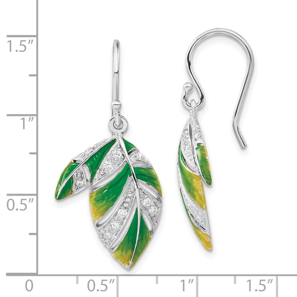 Sterling Silver Green & Yellow Enameled CZ Leaf Dangle Earrings
