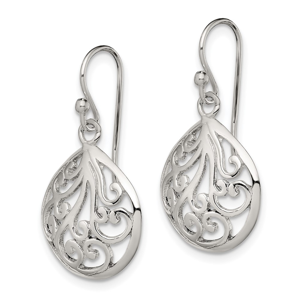 Sterling Silver Polished Filigree Swirl Wide Teardrop Dangle Earrings