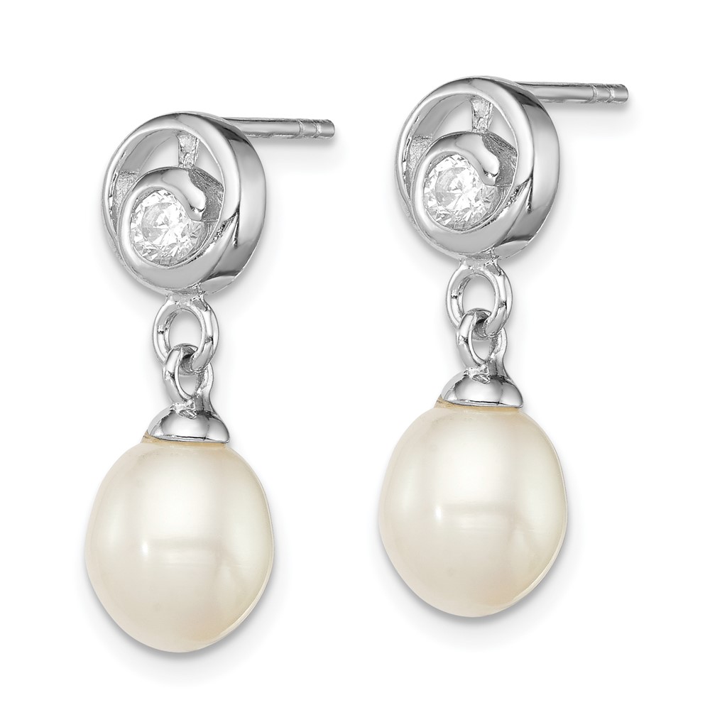 Sterling Silver Rhodium-plated 7-8mm White Rice Freshwater Cultured Pearl and CZ Post Dangle Earrings