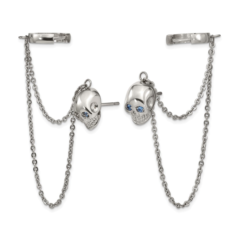 Stainless Steel Polished Earrings w/Hoop Chain Dangle & Blue CZ Post