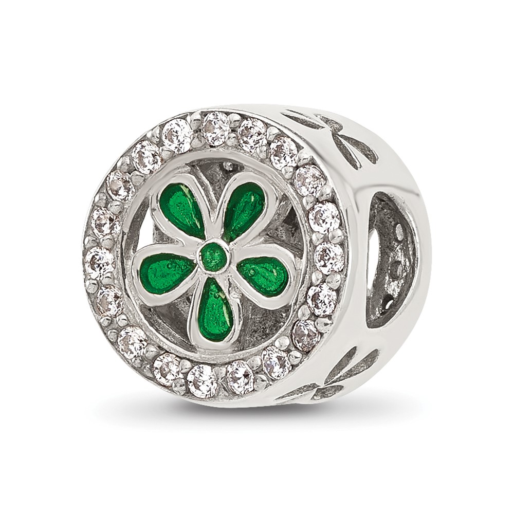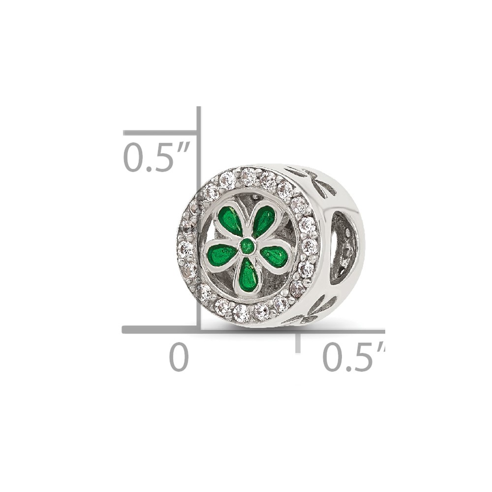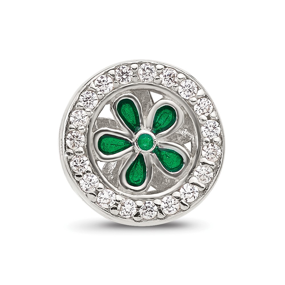 Sterling Silver Reflections Polish CZ and Green Enamel Flower Circle Bead