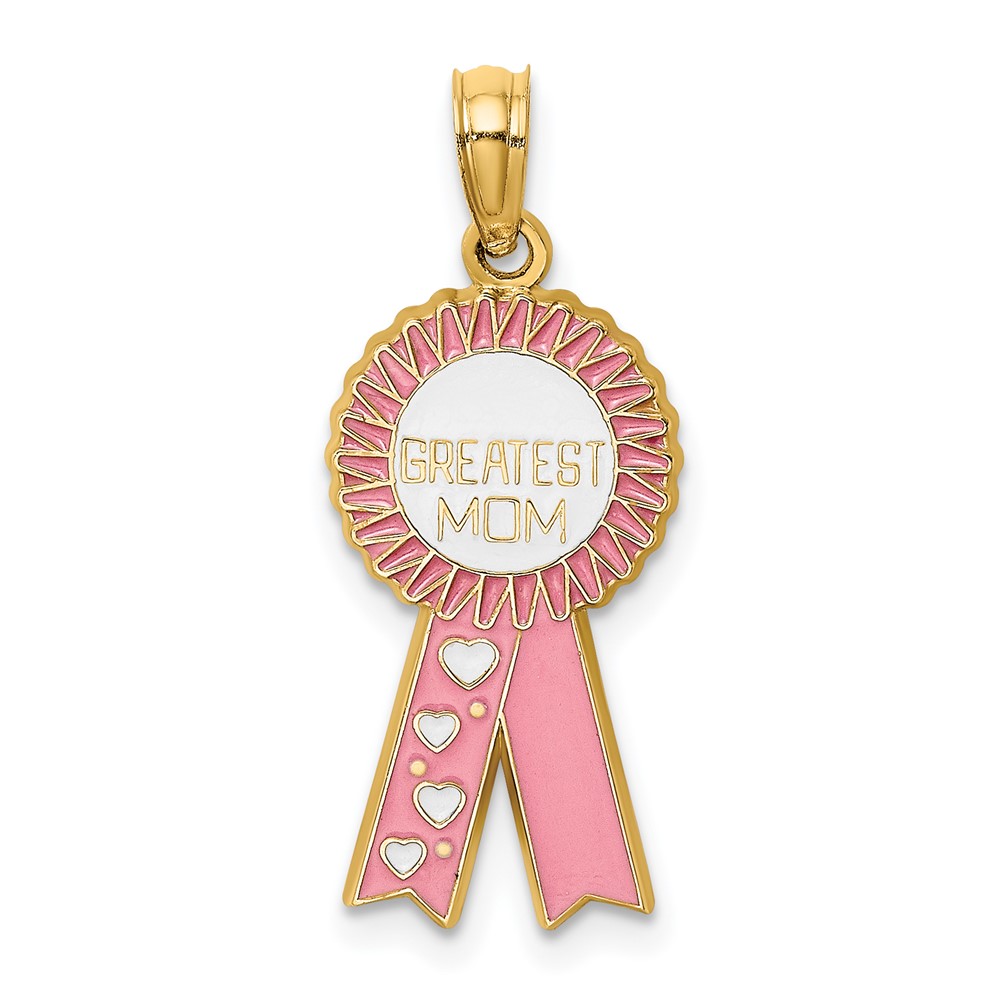 14K GREATEST MOM Enameled Pink Ribbon Charm