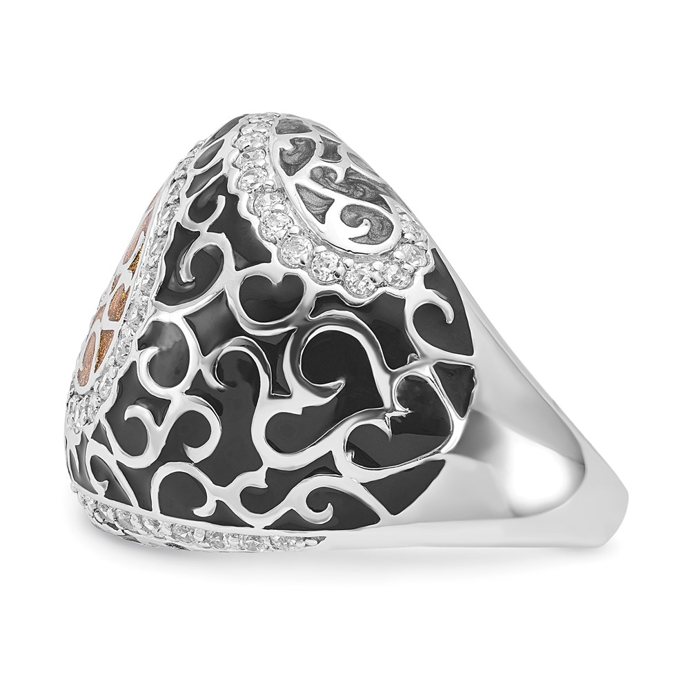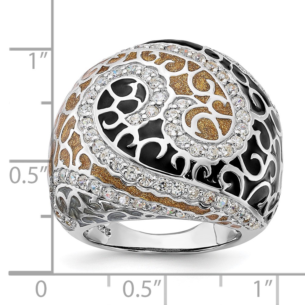 Sterling Silver Polished CZ w/ Black & Gold & Gray Enamel Filigree Ring