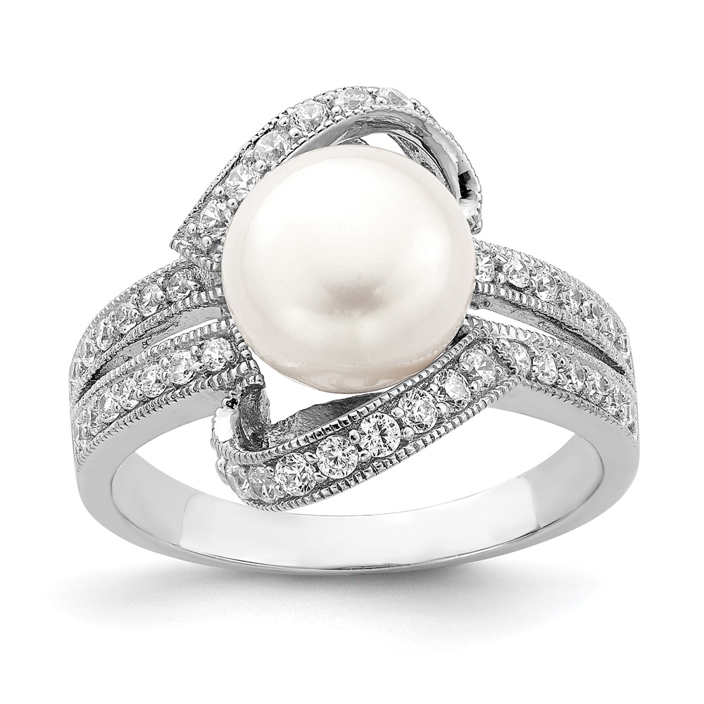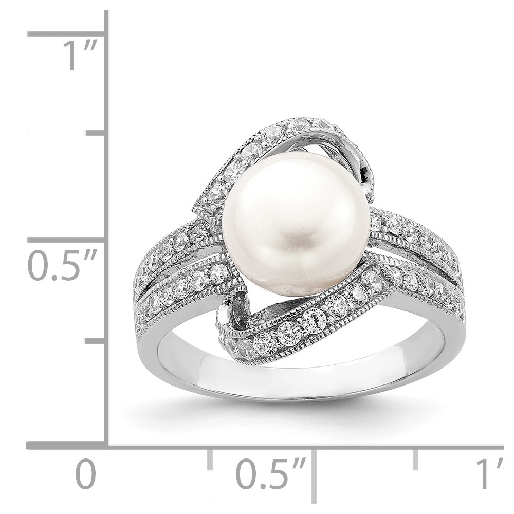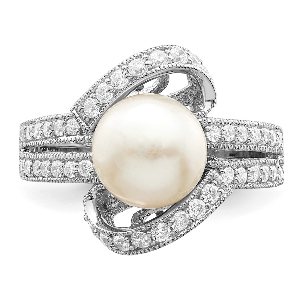 Sterling Silver Rhodium-plated Simulated Pearl and CZ Ring
