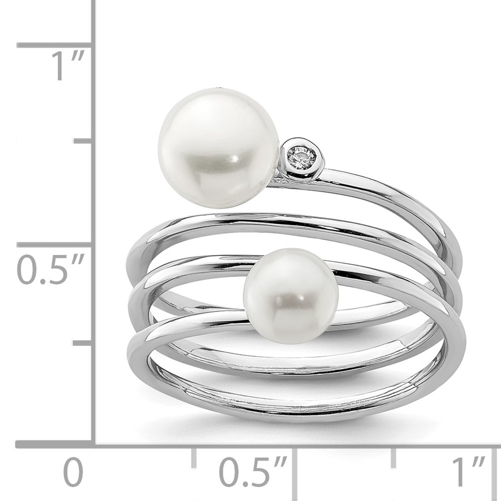 Sterling Silver Rhodium-plated 5-7mm White Button Freshwater Cultured Pearl and CZ Adjustable Ring