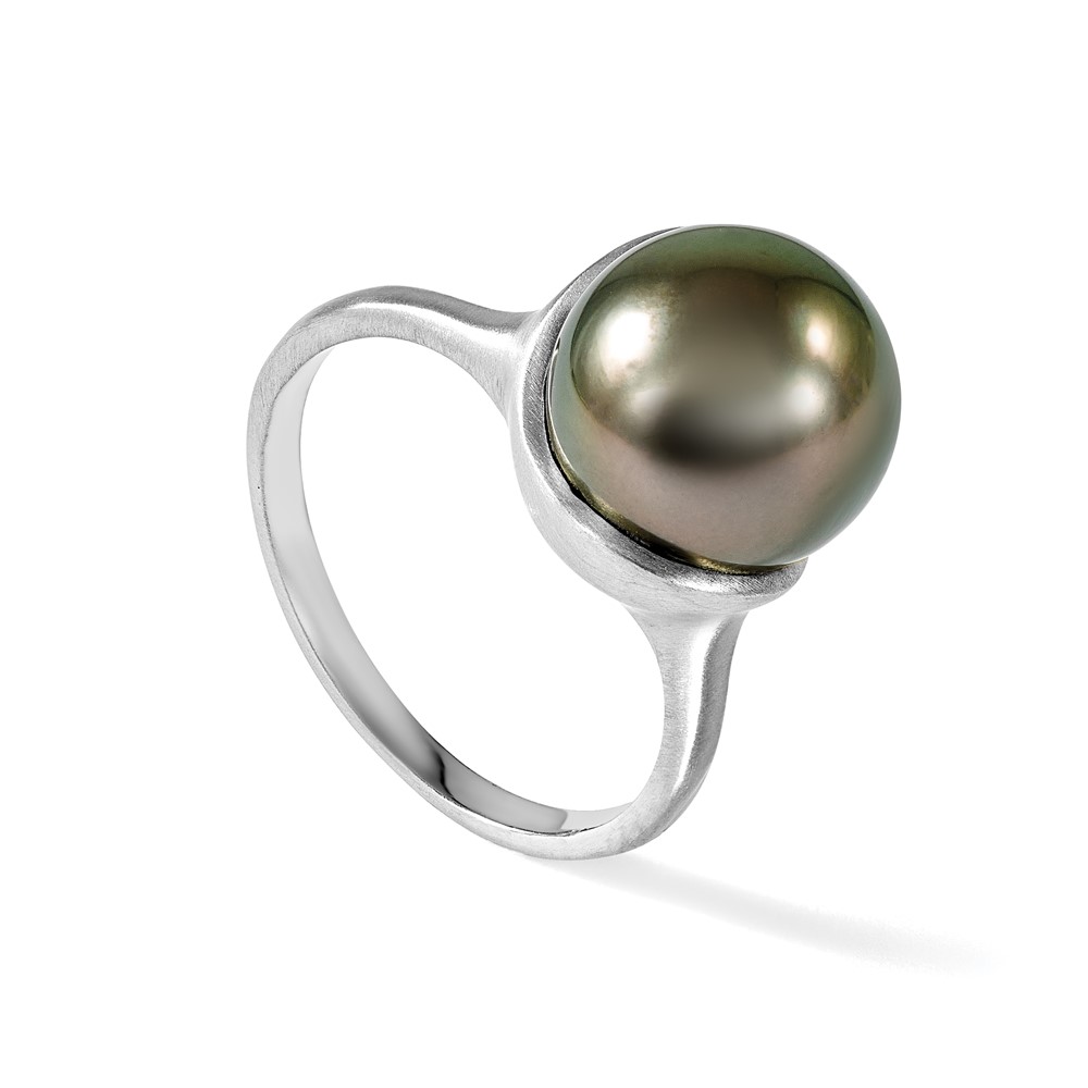 14k White Gold Brushed 10-11mm Round Black Tahitian Saltwater Cultured Pearl Ring
