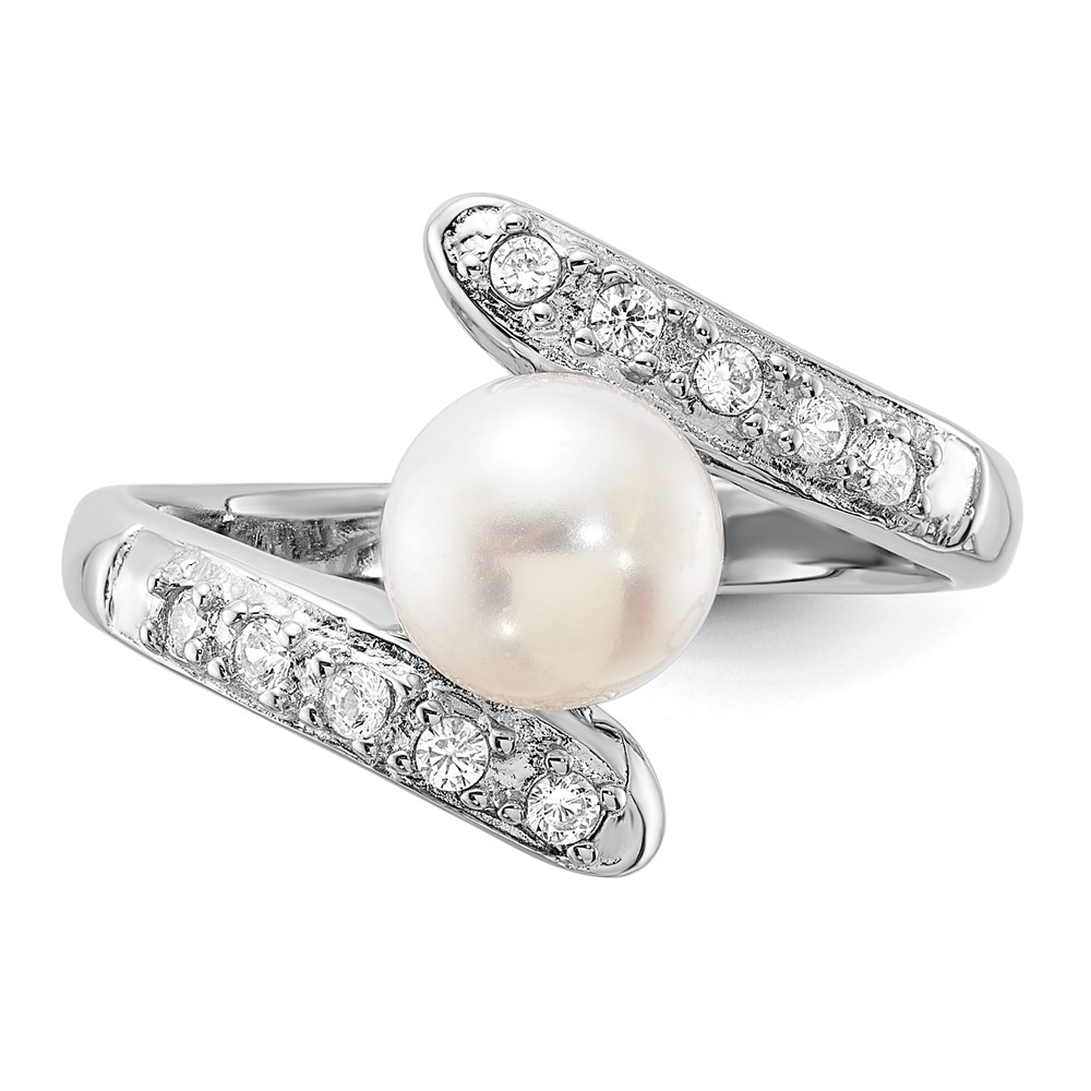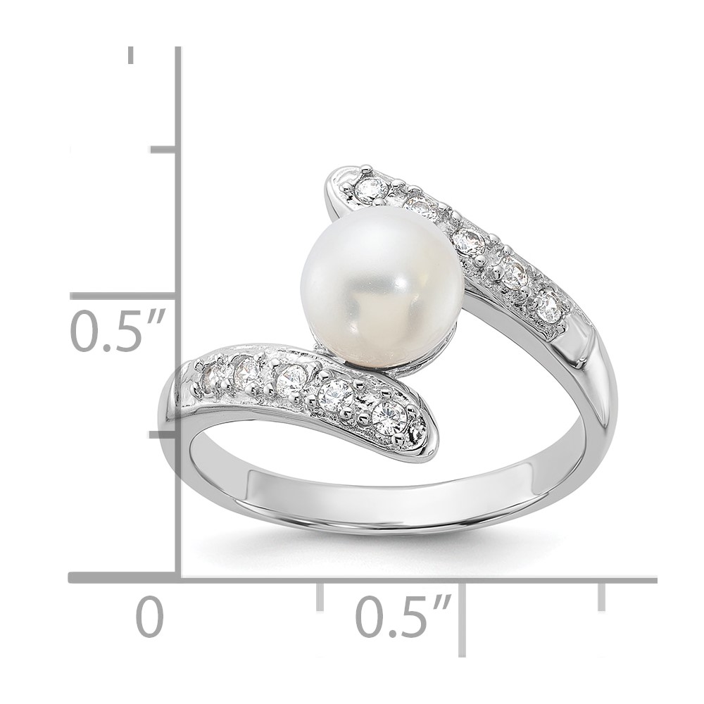 Sterling Silver Rhodium-plated 6-7mm White Freshwater Cultured Pearl and CZ Bypass Ring
