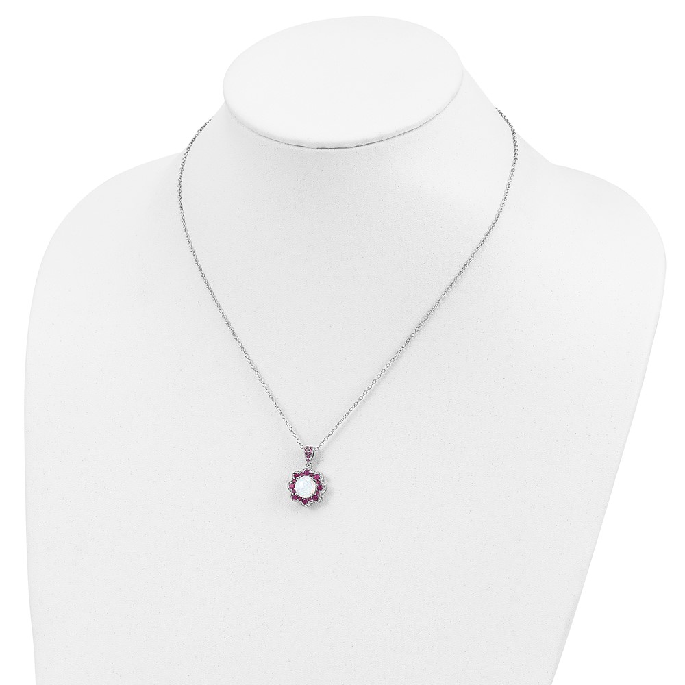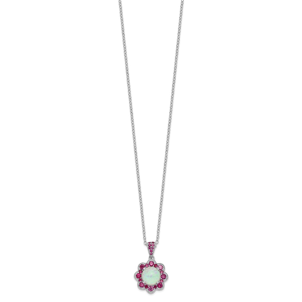 Cheryl M Sterling Silver Rhodium-plated Cabochon Lab Created Opal and Brilliant-cut Red Nano Crystal Flower 18 Inch Necklace