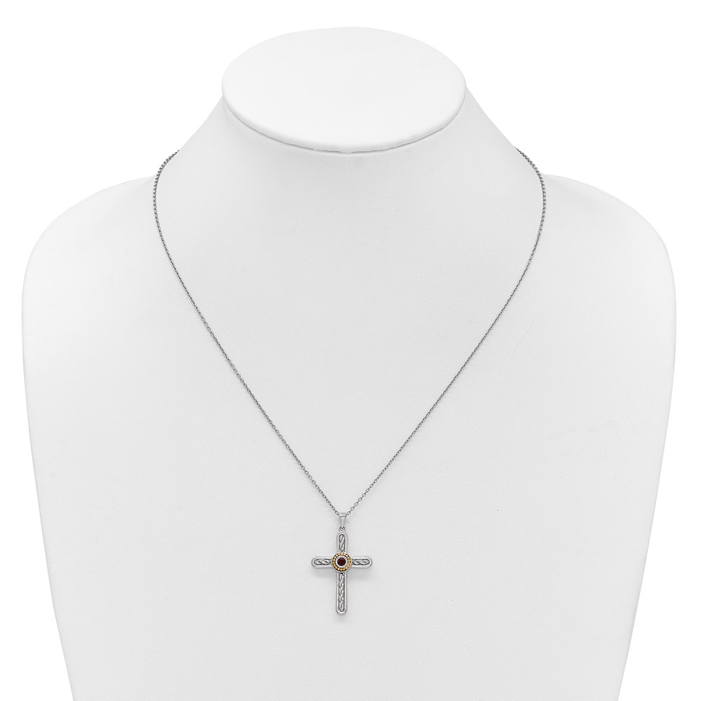 Shey Couture Sterling Silver Rhodium-plated with 14k Accent Round Garnet Textured Cross 18 inch with 2 inch Extension Necklace