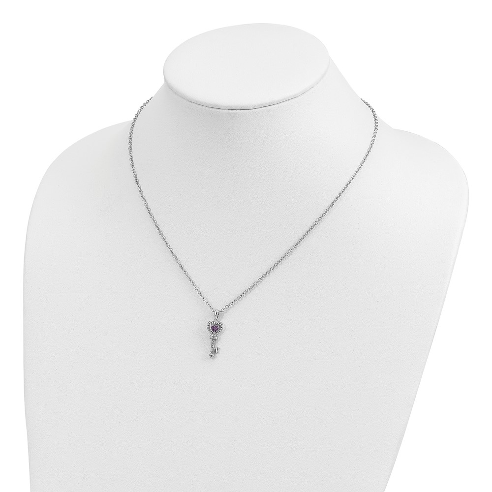 Brilliant Gemstones Sterling Silver with 14K Accent Rhodium-plated Amethyst and Diamond Key 18 Inch Necklace with 2 Inch Extender