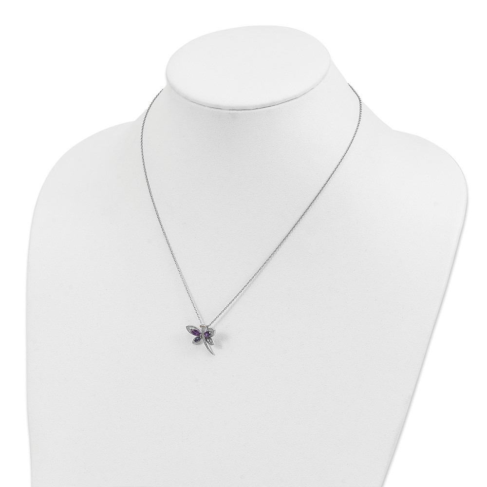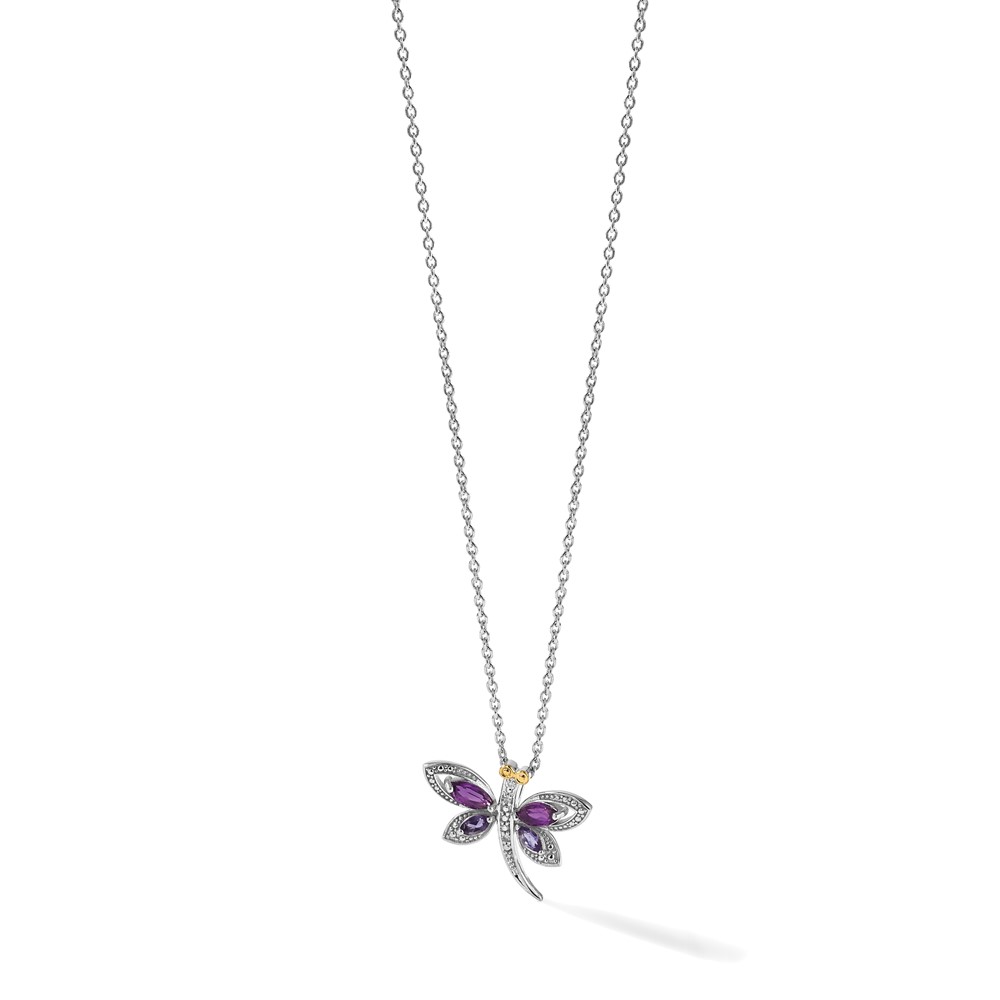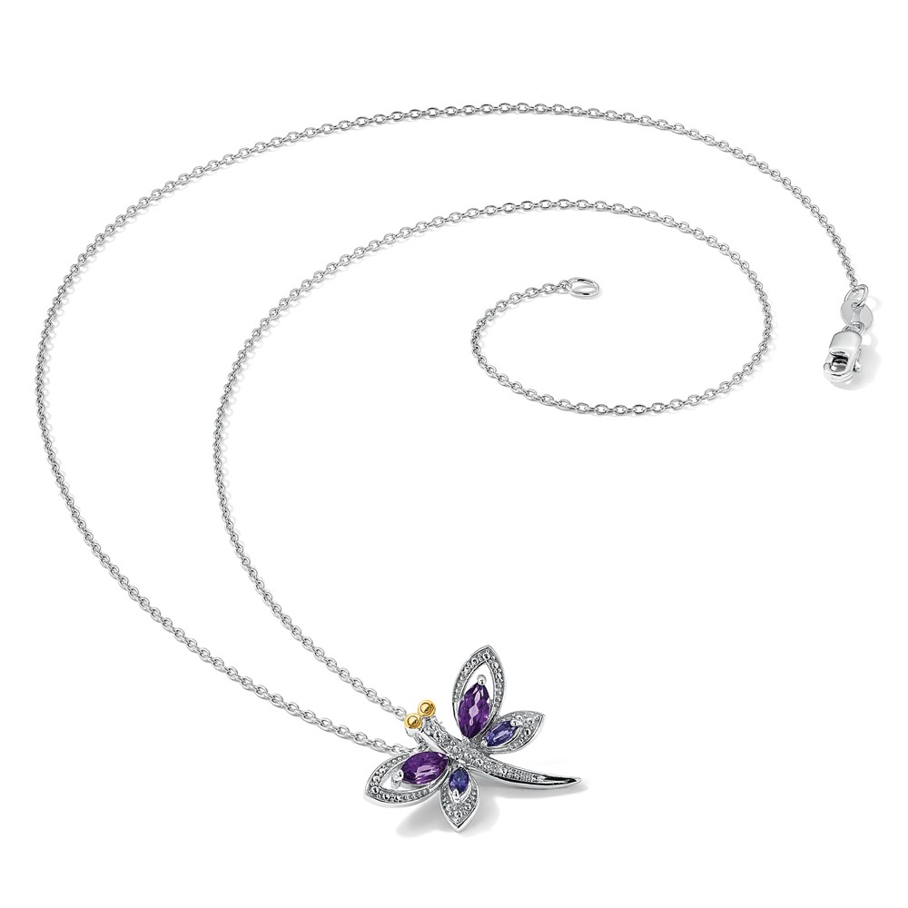 Brilliant Gemstones Sterling Silver with 14K Accent Rhodium-plated Amethyst/Iolite/Diamond Dragonfly18 Inch Necklace with 2 Inch Extender