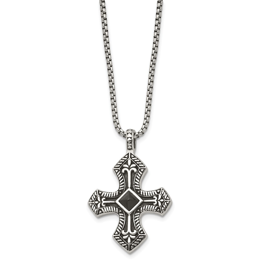 Stainless Steel Antiqued and Brushed w/Black Agate Cross 24in Necklace