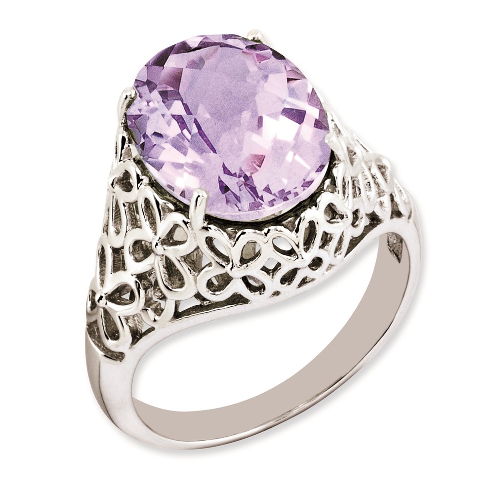 Sterling Silver Rhodium-plated Oval Checker-Cut Pink Quartz Ring