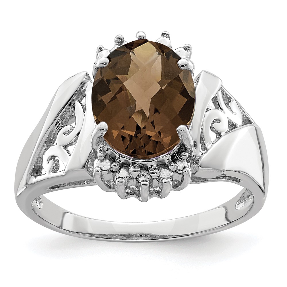 Sterling Silver Rhodium Checker-Cut Smoky Quartz & Oval Diam. Ring