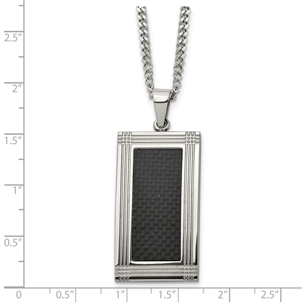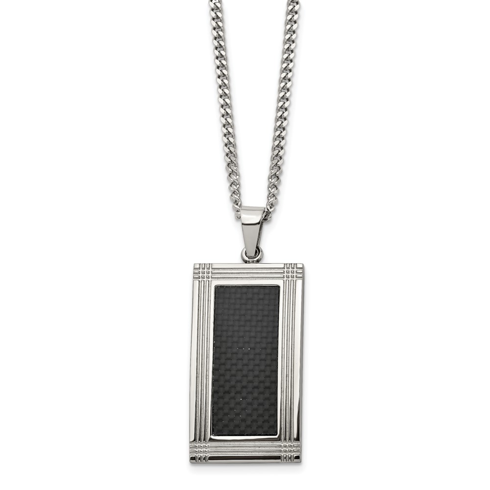 Chisel Stainless Steel Polished Grooved Black Carbon Fiber Inlay Rectangle Dog Tag on a 24 inch Curb Chain Necklace