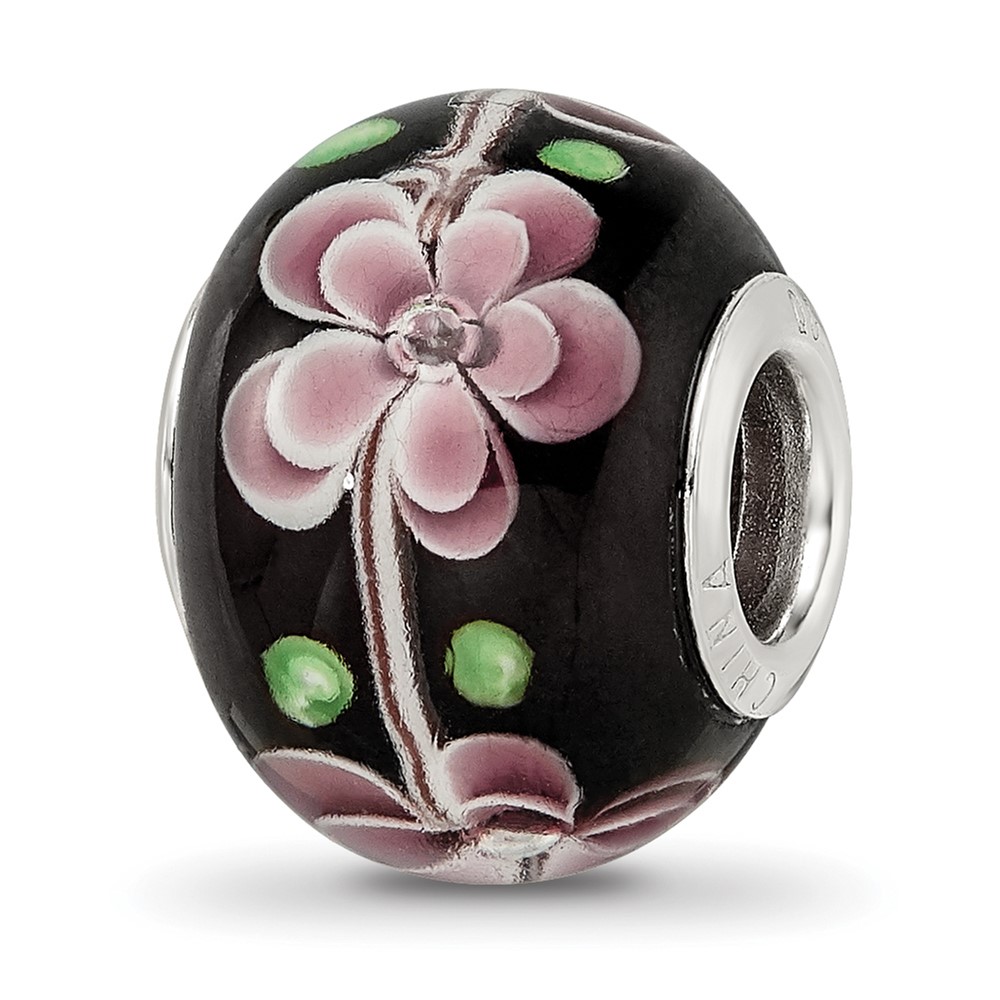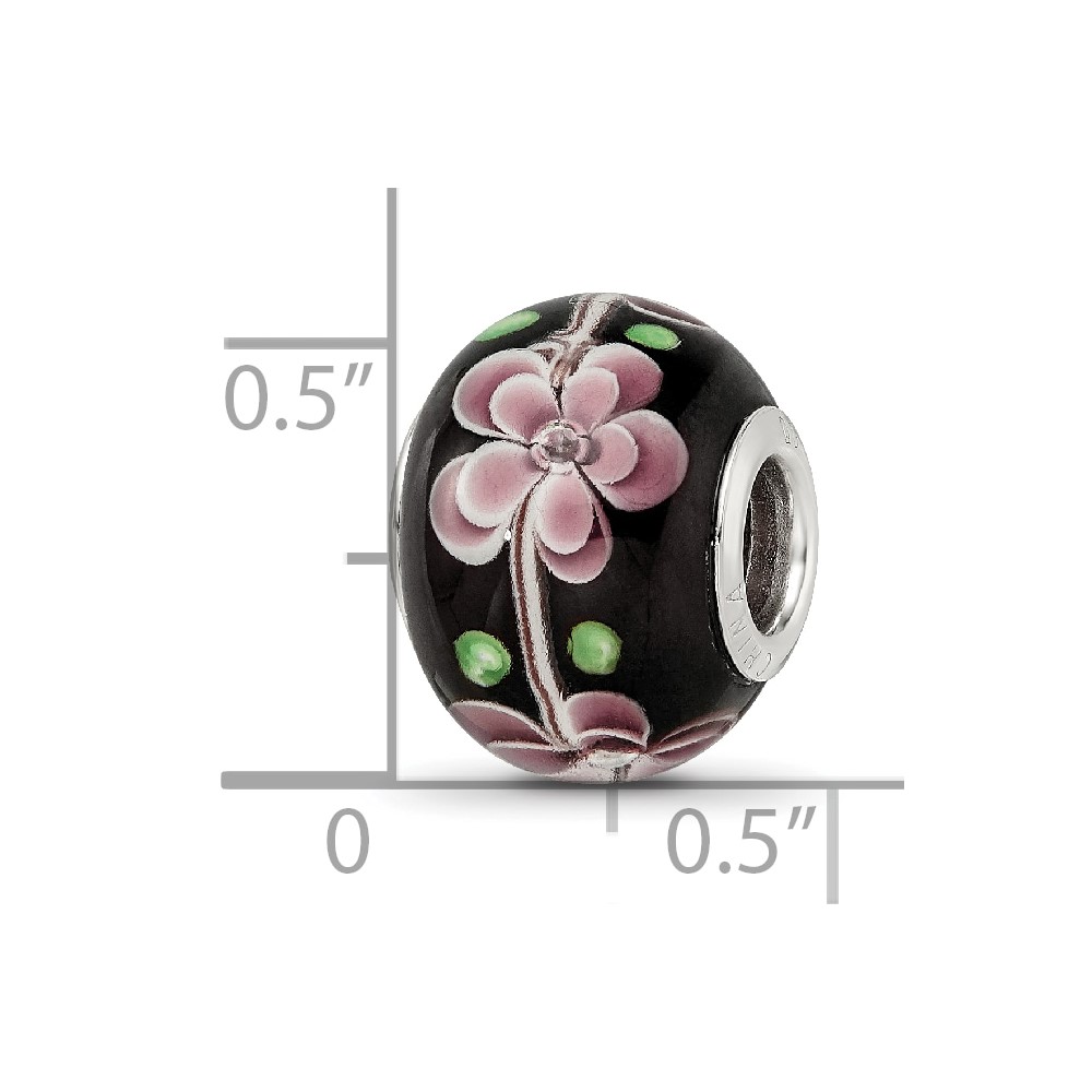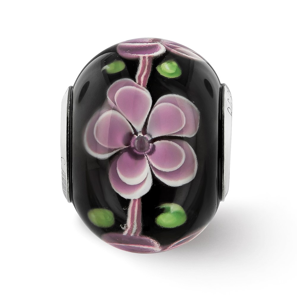 Sterling Silver Reflections Rh-plated Pink & Green Floral Black Glass Bead