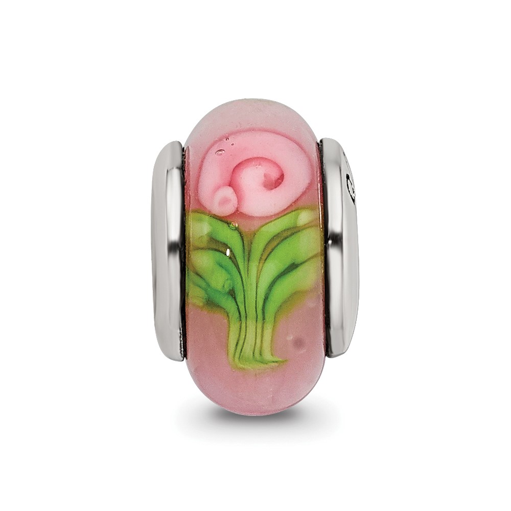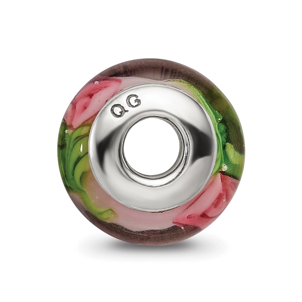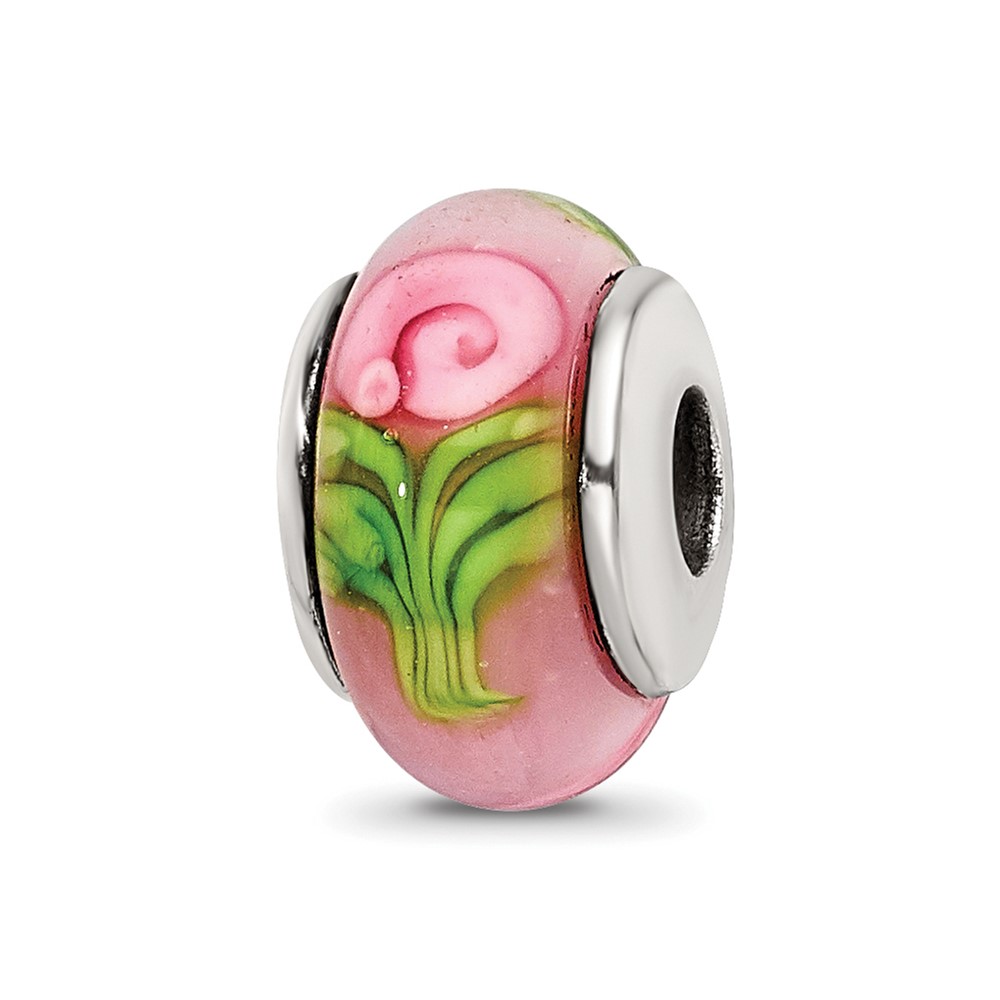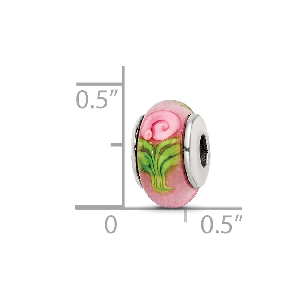 Kids Collection Sterling Silver Hand-blown Pink with Flower Pattern Glass Reflections Bead