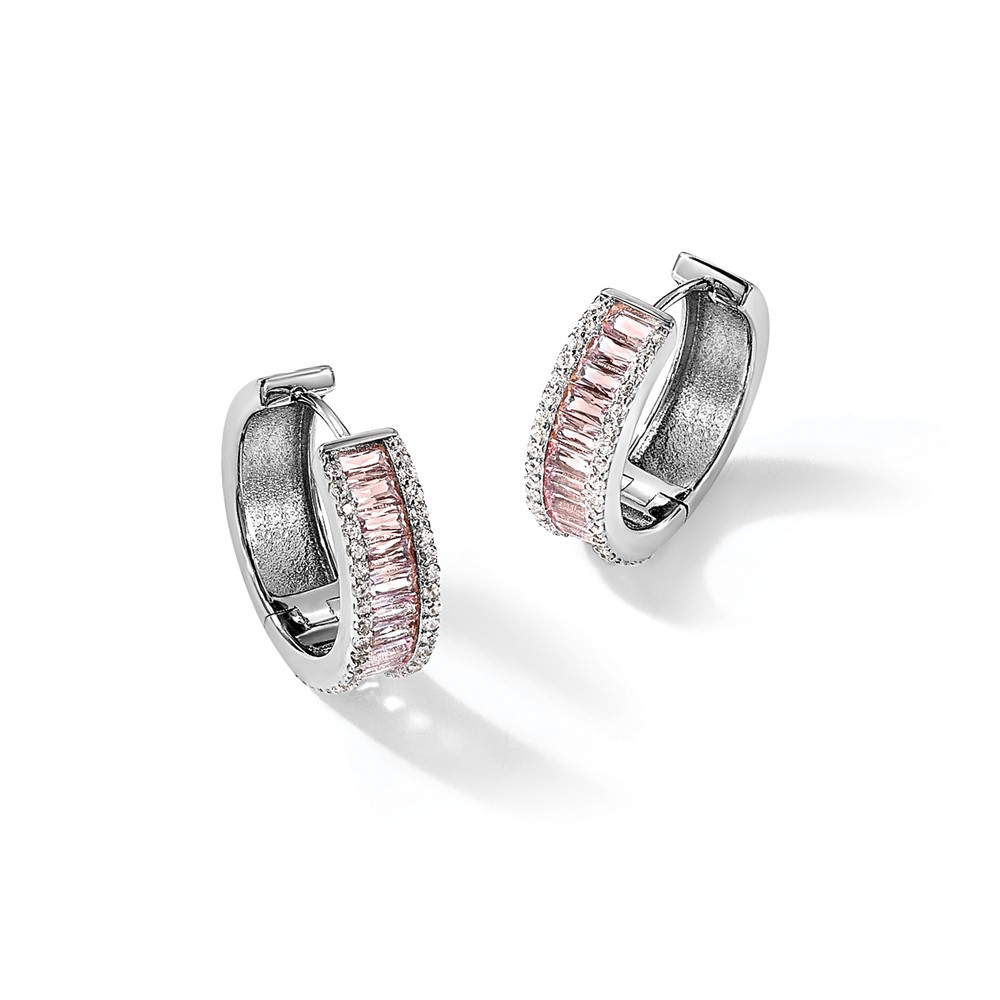 Cheryl M Sterling Silver Rhodium-plated Emerald-cut Pink Nano Crystal and White Brilliant-cut CZ Round Hinged Hoop Earrings
