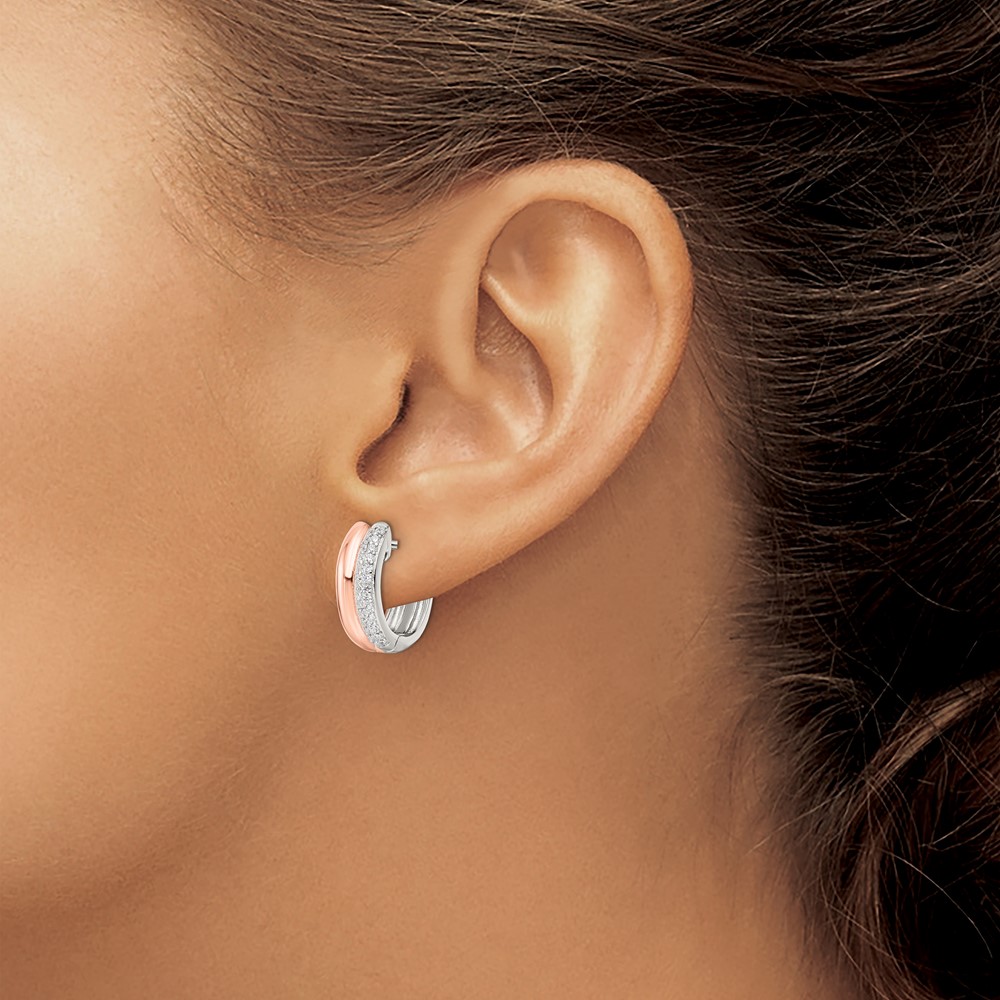 Sterling Silver Rose-tone Polished Pave CZ Hinged Hoop Earrings