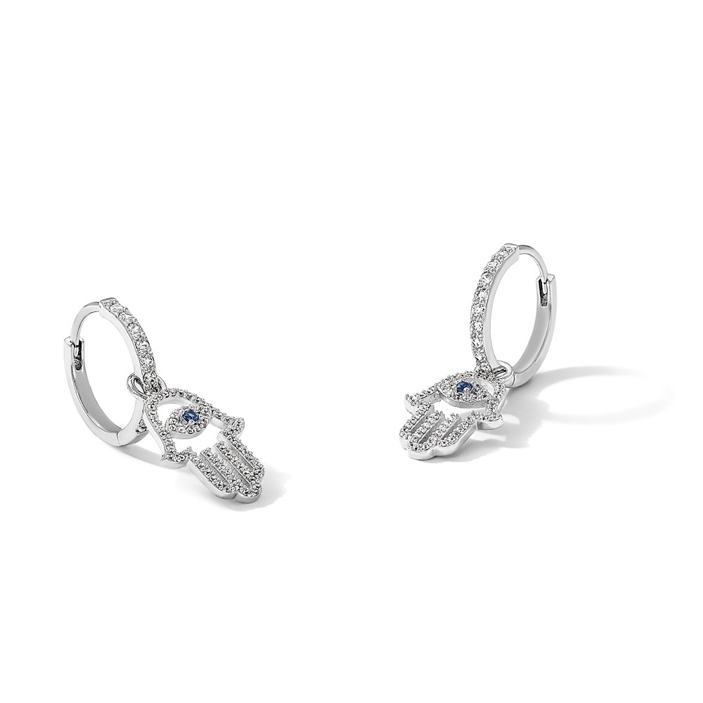 Sterling Silver RH-pltd Blue/White CZ Evil Eye Hamsa Dangle Hoop Earrings