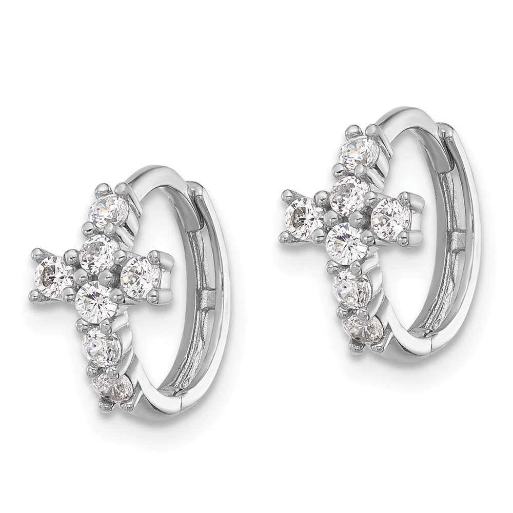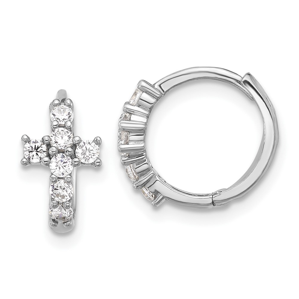 Sterling Silver RH-plated Polished CZ Cross Hinged Round Hoop Earrings