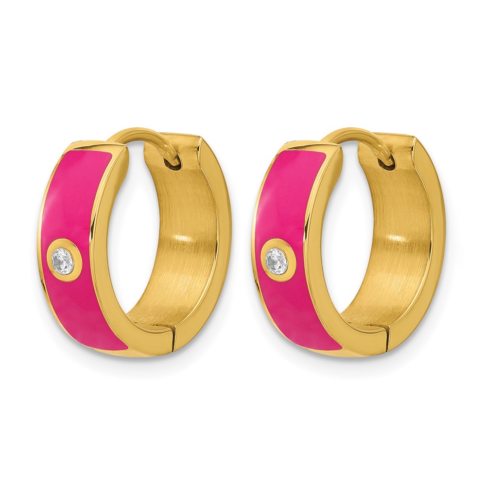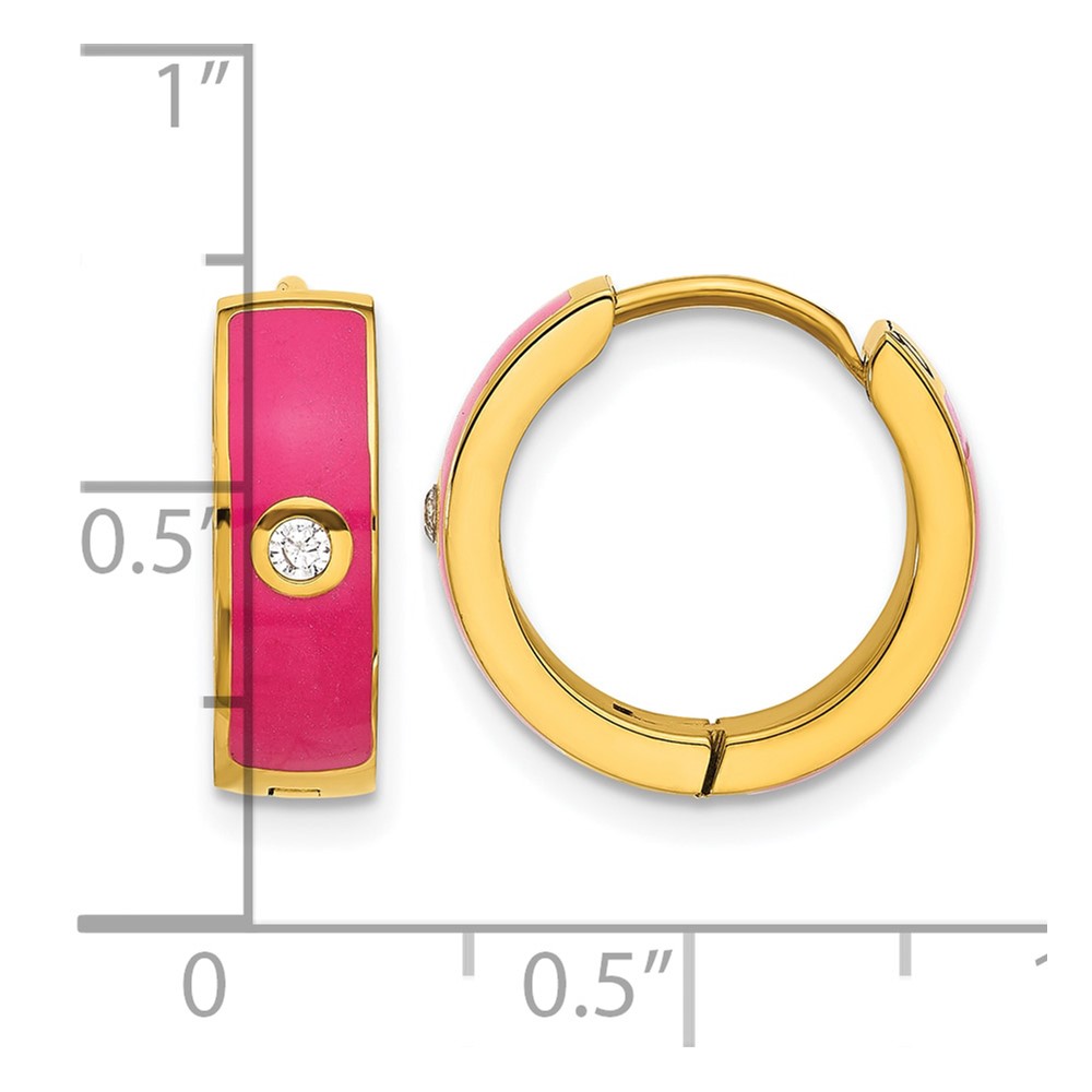 Chisel Stainless Steel Polished Yellow IP-plated with Dark Pink Enamel and CZ 5mm Hinged Hoop Earrings