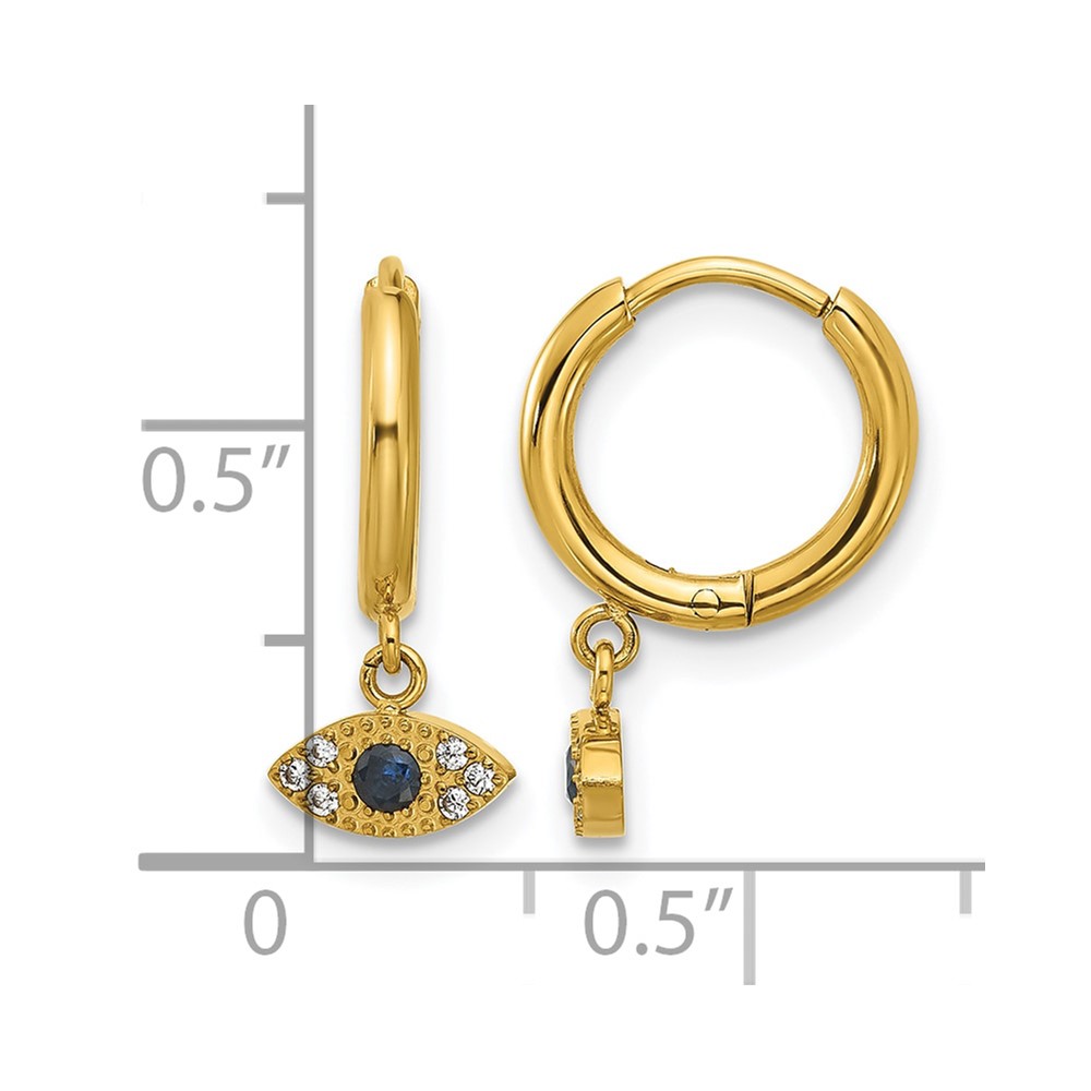 Chisel Stainless Steel Polished Yellow IP-plated Blue and White Zircon Evil Eye Dangle Hinged Hoop Earrings