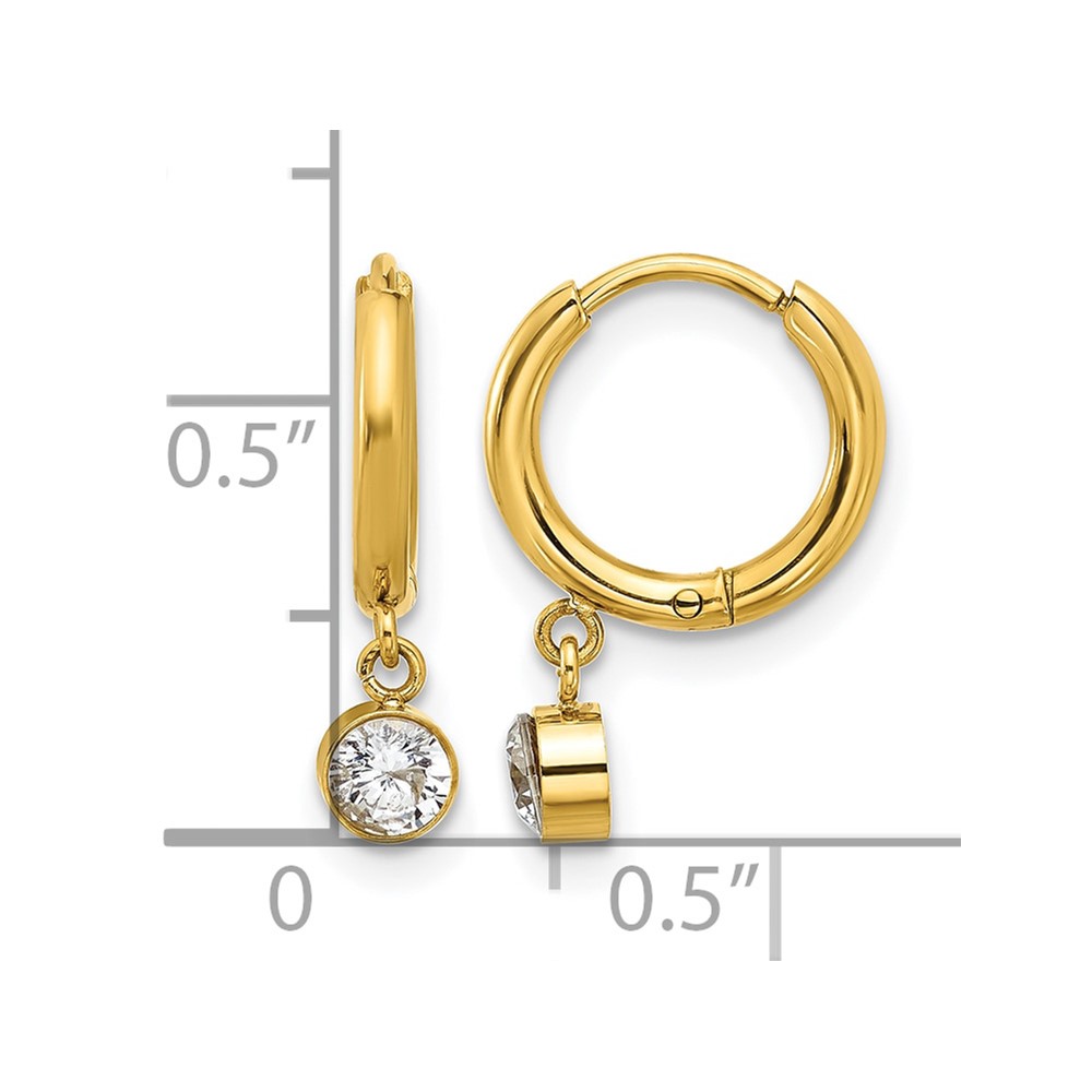 Chisel Stainless Steel Polished Yellow IP-plated White Zircon Dangle Hinged Hoop Earrings
