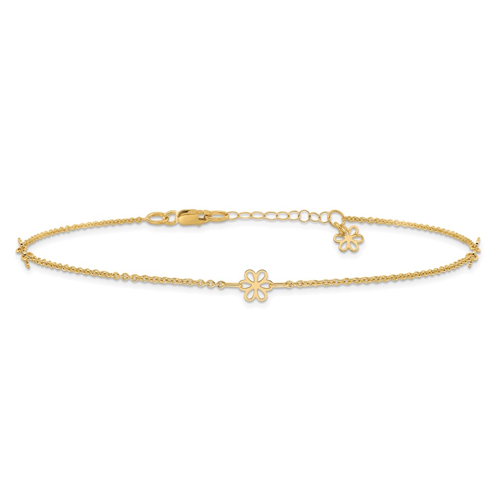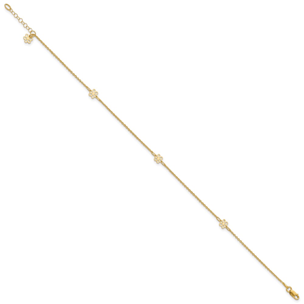 14K Flowers 3-Station with Flower Dangle 10 inch Plus 1 inch Extender - Total 11 inch Anklet
