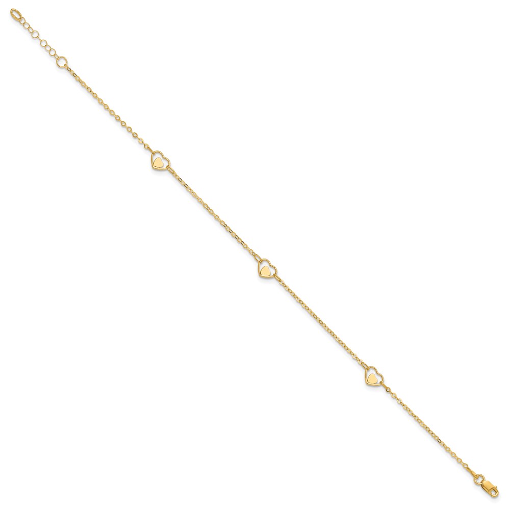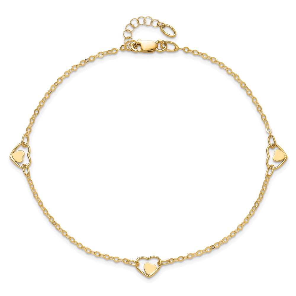 14K Polished Heart-in-Heart Links 3-Station 9 inch Plus 1 inch Extender - Total 10 inch Anklet
