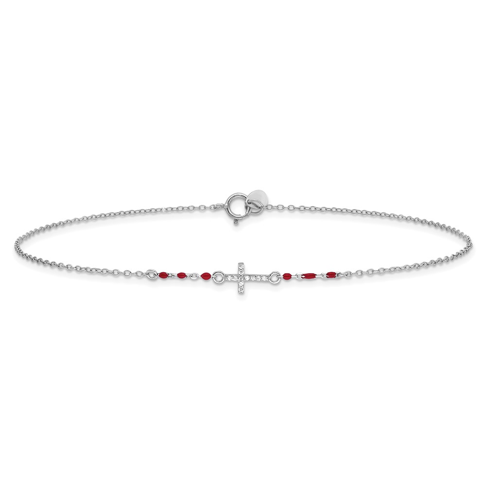 Sterling Silver Rhodium-plated Polished CZ Red Enamel Bead Cross Anklet