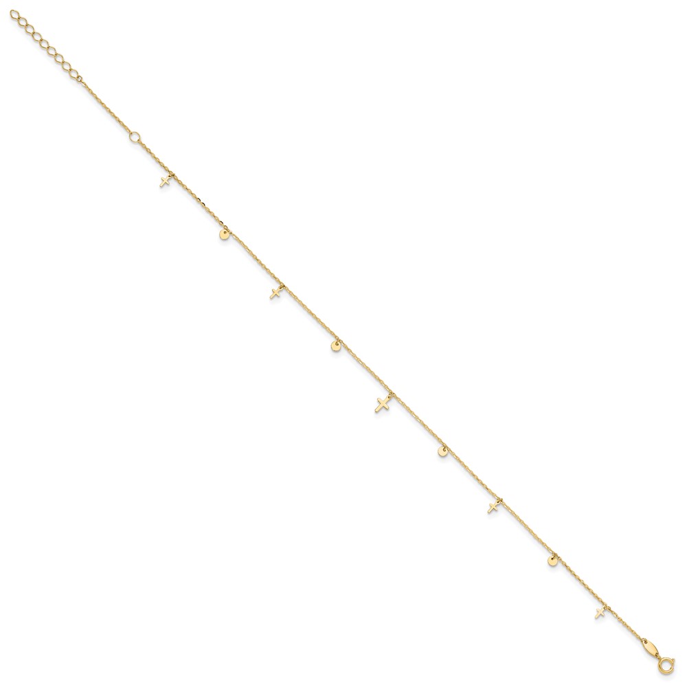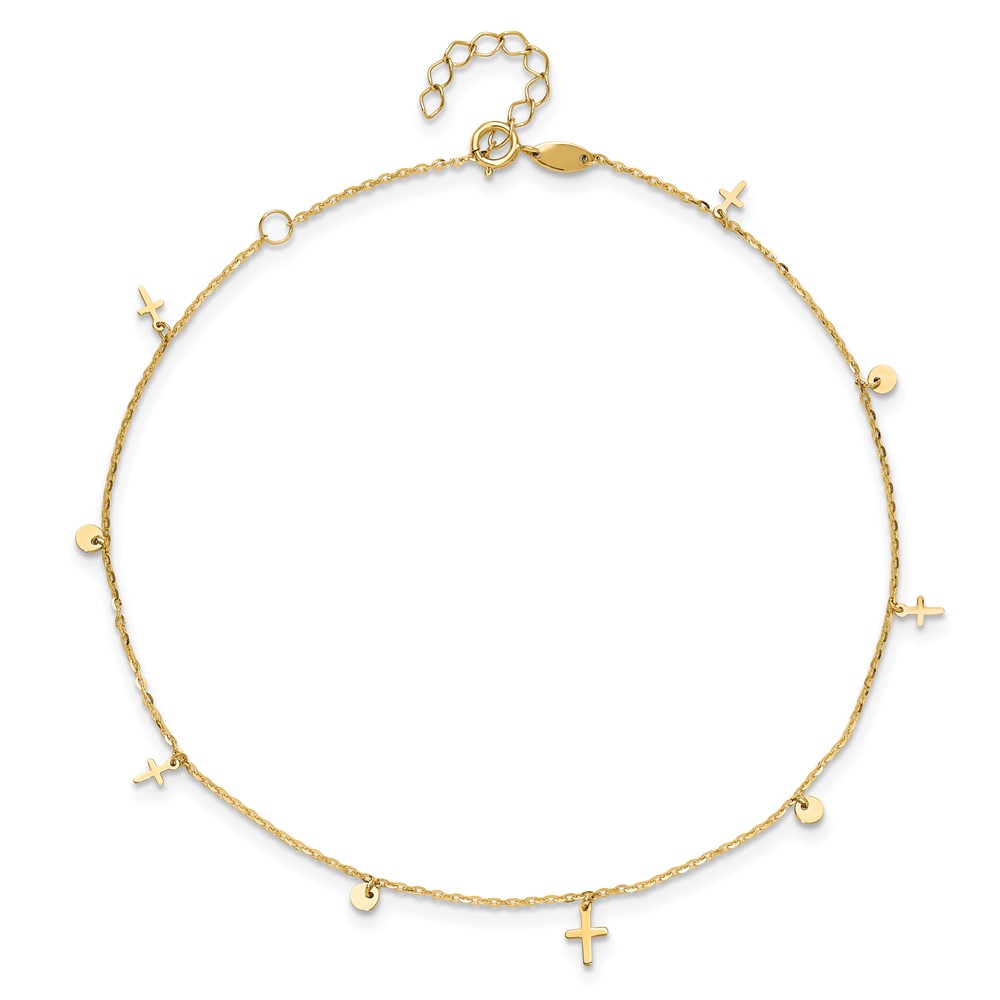 14K Polished Dangle Crosses and Circles 9 inch Plus 2 in Extender - Total 11 inch Anklet