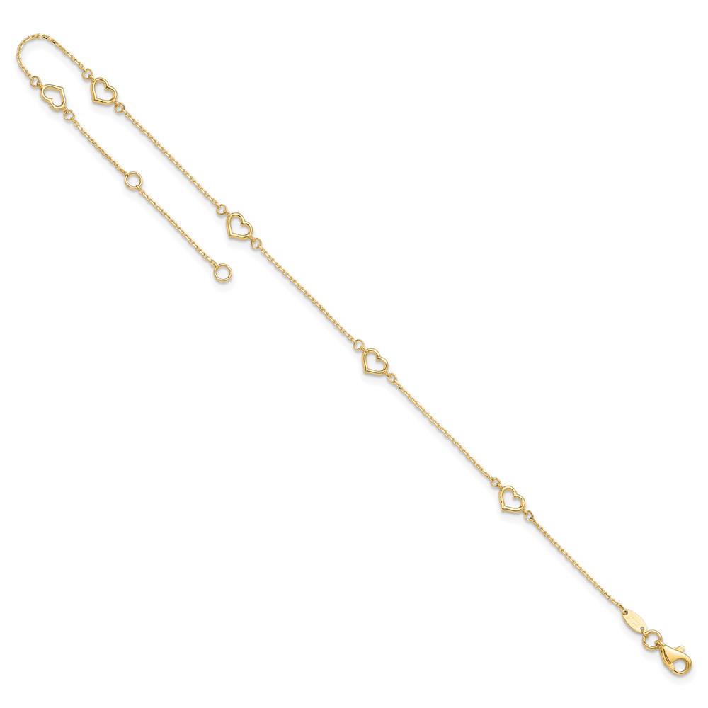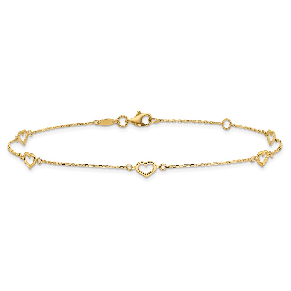 14K Open Heart and Chain 5-Station 9 inch Plus 1 inch Extender - Total 10 inch Anklet