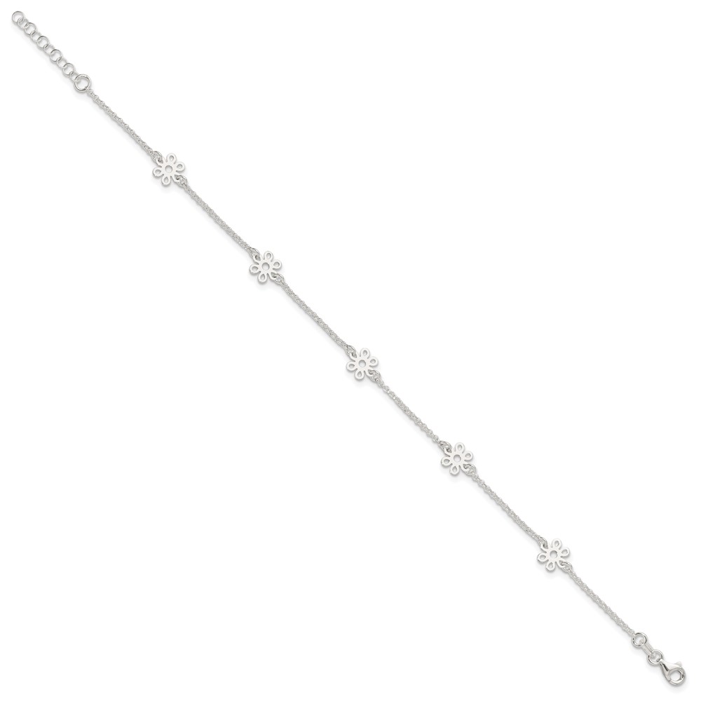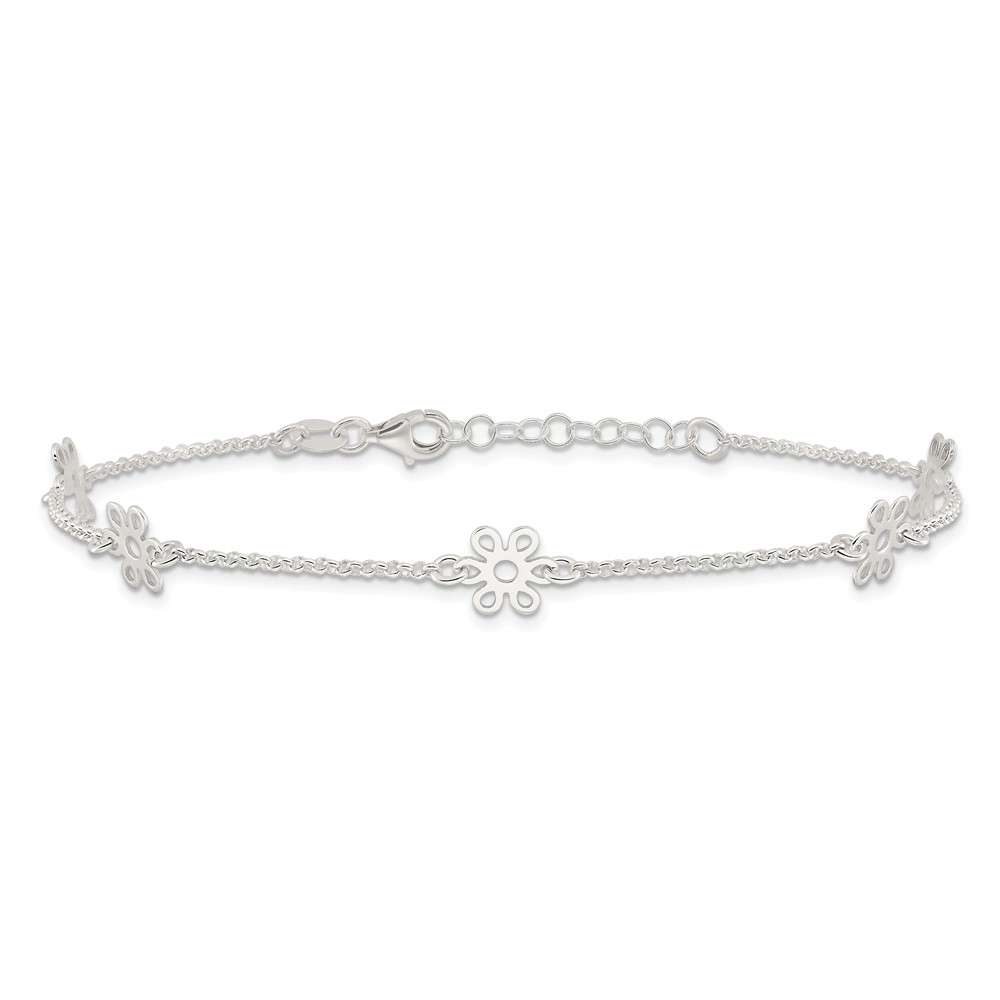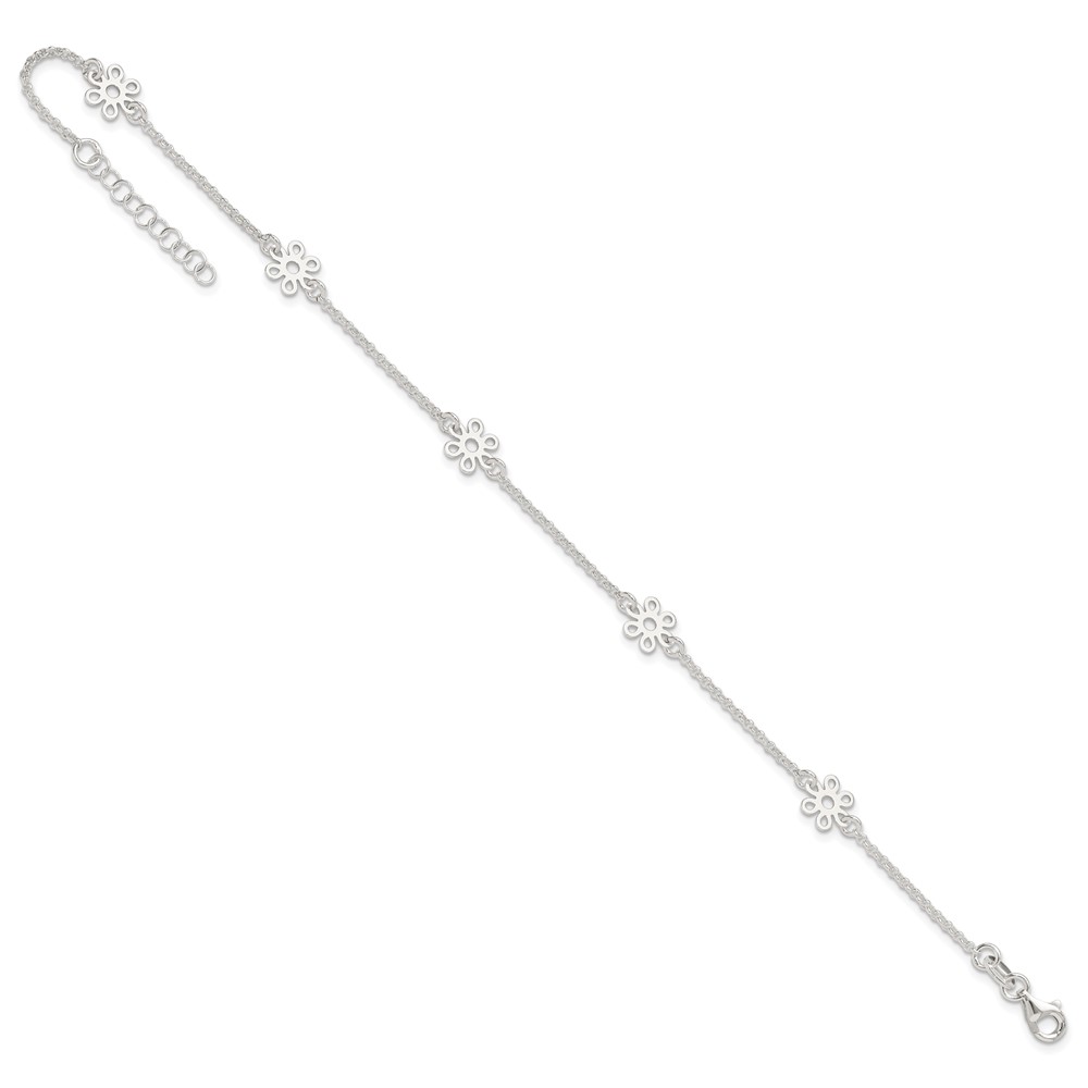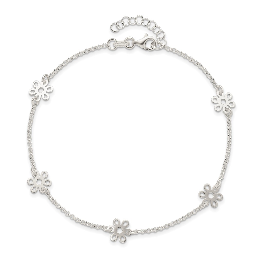Sterling Silver Cable Chain/Flowers 5-Station 10 inch Plus 1 inch Extender - Total 11 inch Anklet