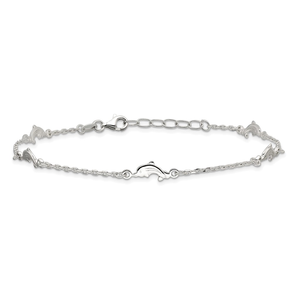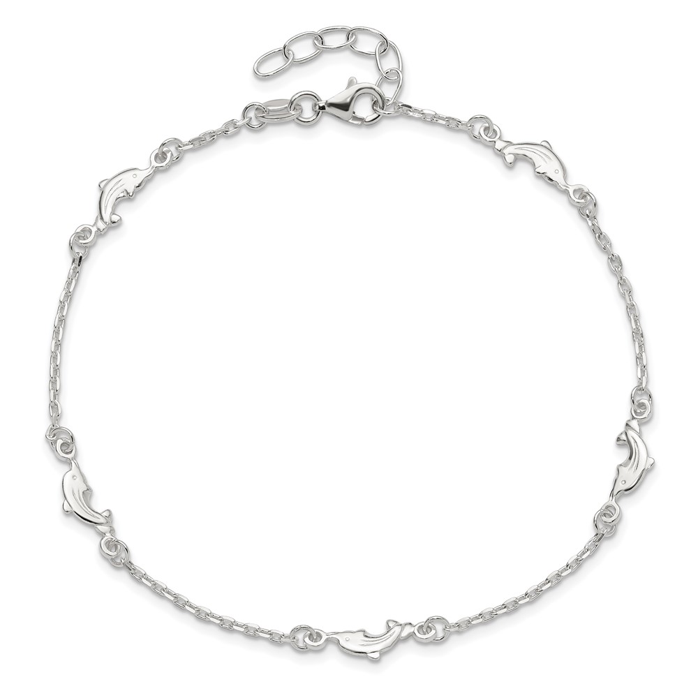Sterling Silver Dolphin 5-Station 10 inch Plus 1 inch Extender - Total 11 inch Anklet