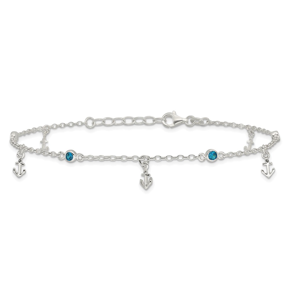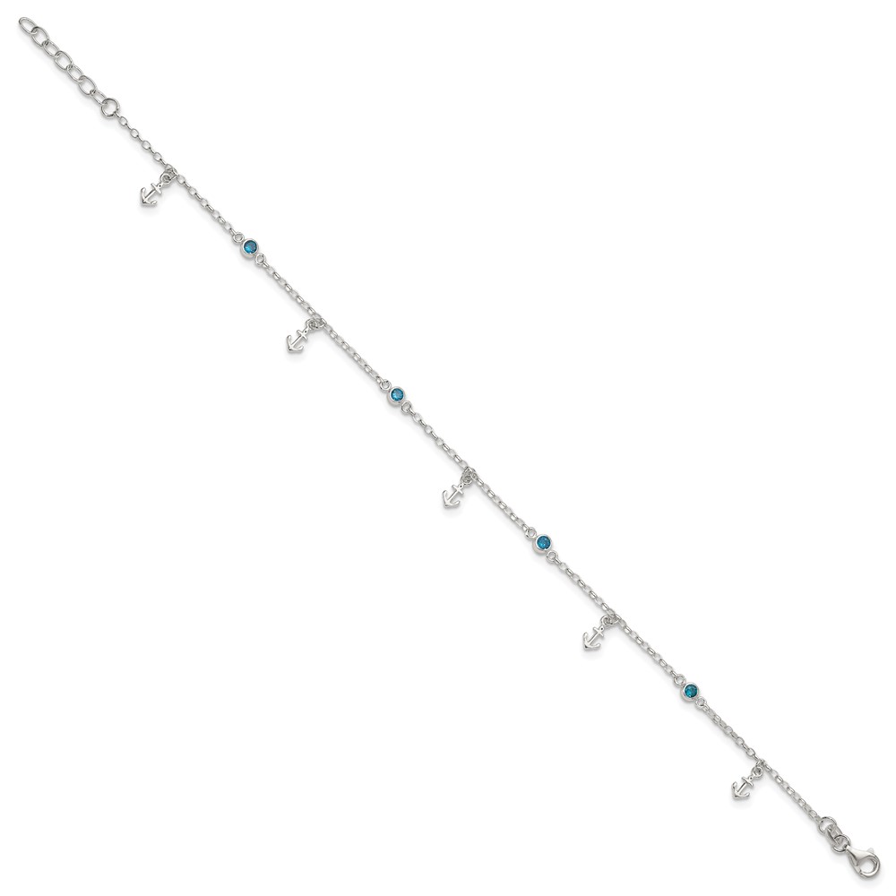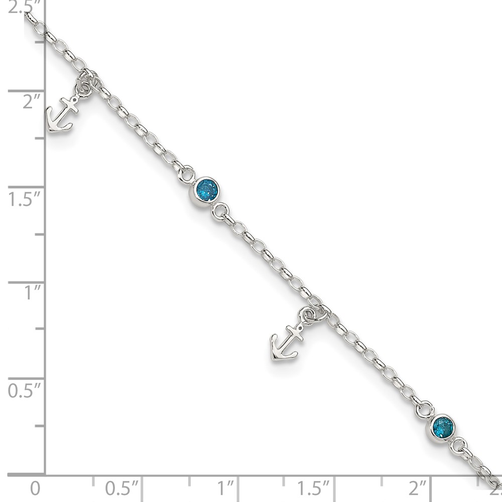 Sterling Silver Blue CZ / Anchors 9 inch Plus 1 inch Extender - Total 10 inch Anklet