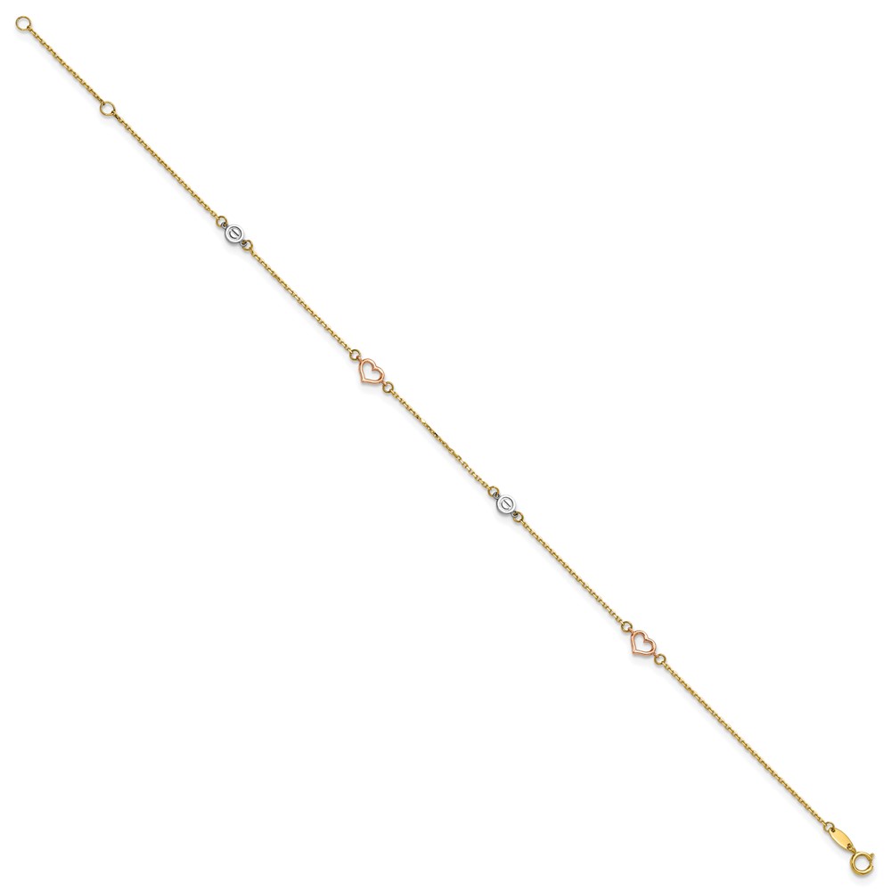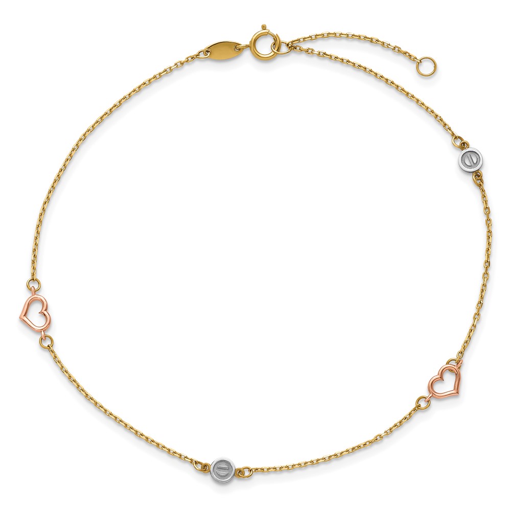 14k Tri-color Polished Hearts and Circles 9 inch Plus 1 inch Extender - Total 10 inch Anklet