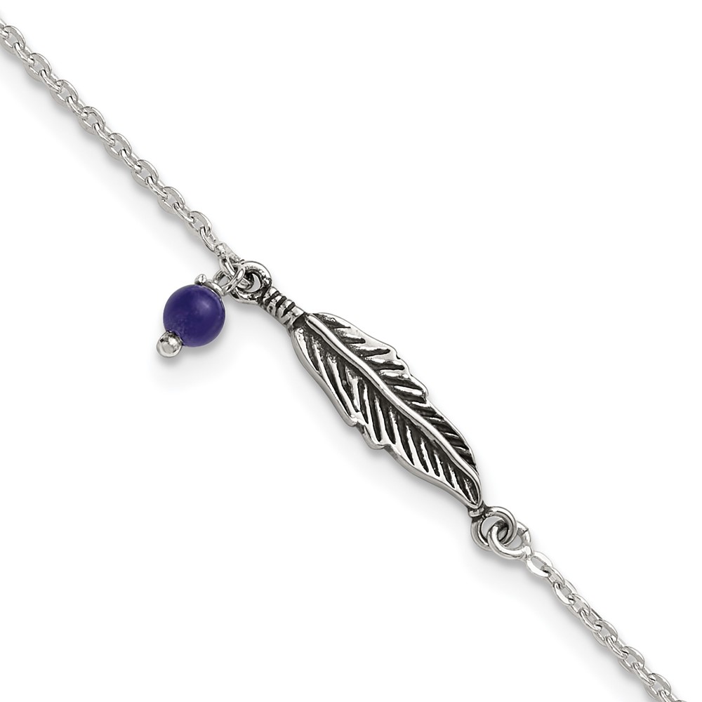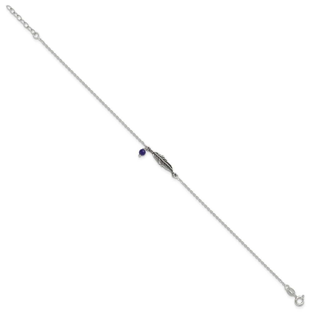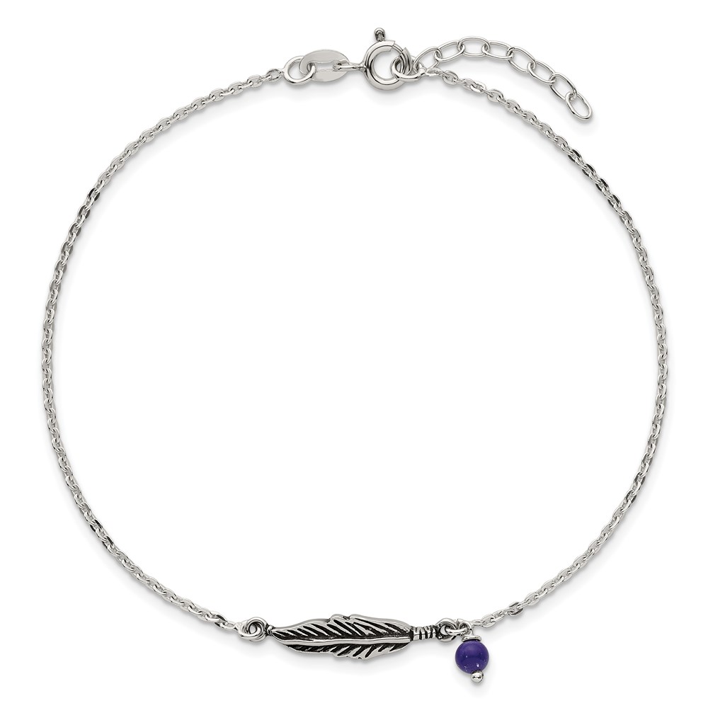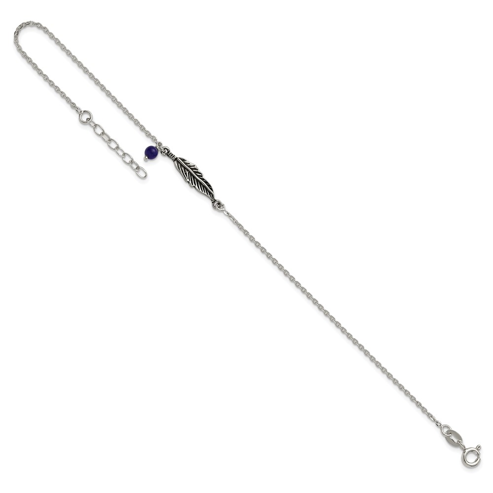 Sterling Silver Antiqued Blue Lapis/Feather 9 inch Plus 1 inch Extender - Total 10 inch Anklet