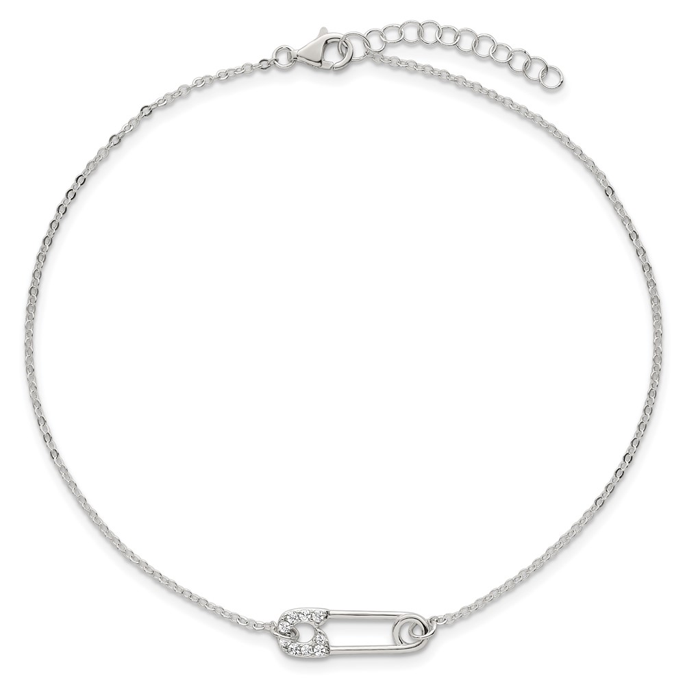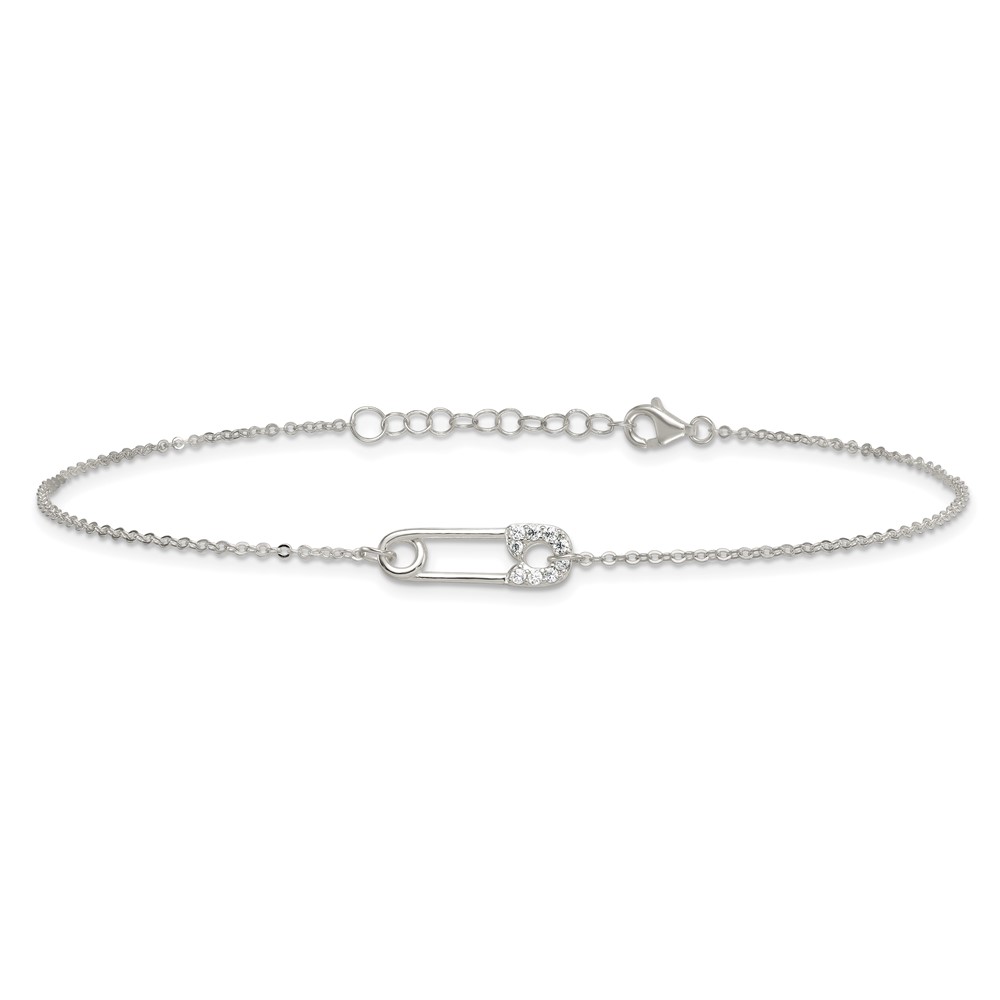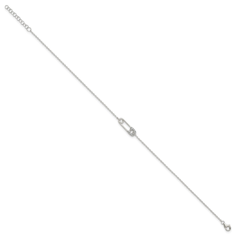 Sterling Silver CZ Safety Pin 9 Inch Plus 1 Inch Extender - Total 10 inch Anklet