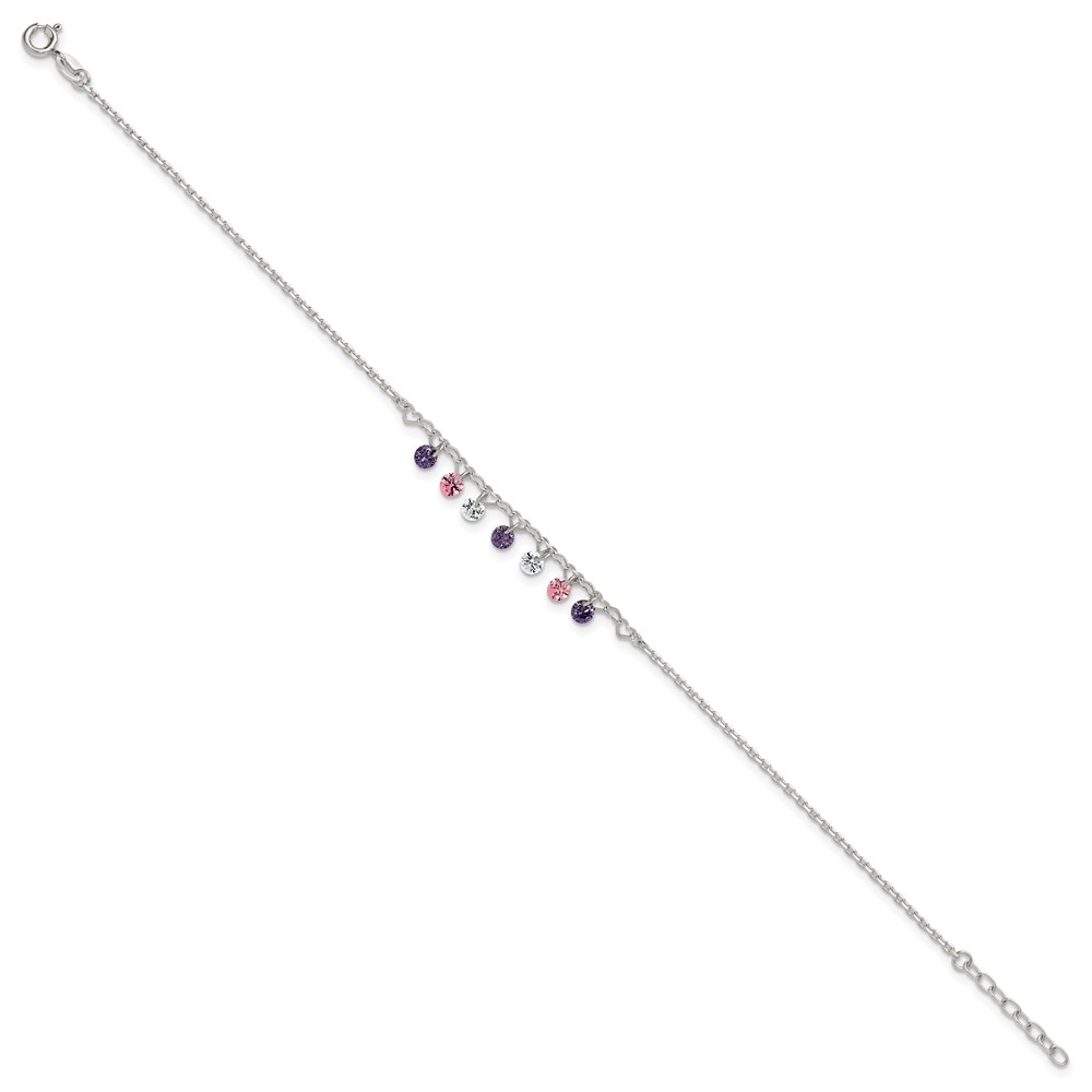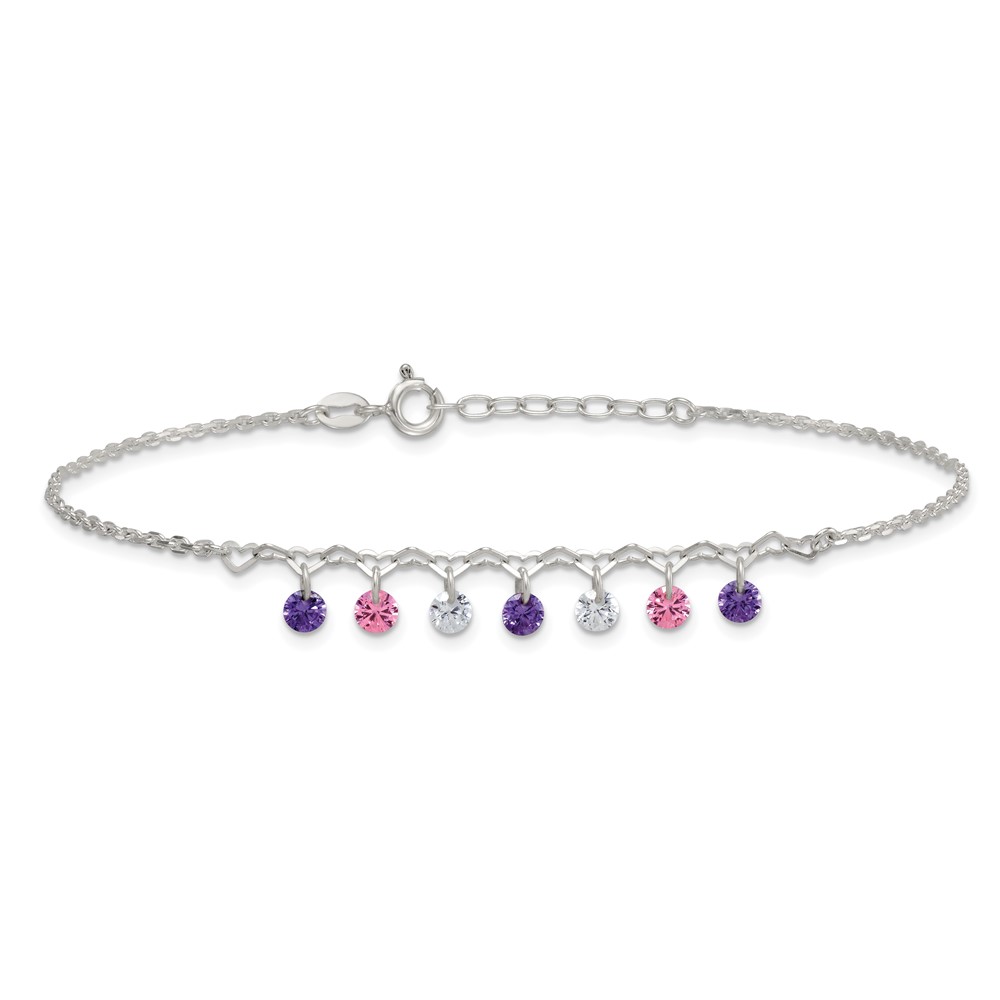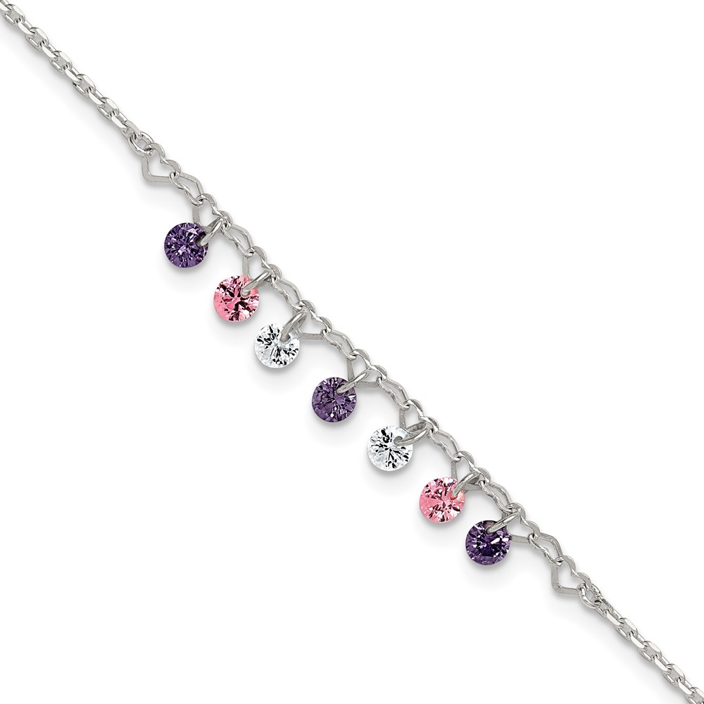 Sterling Silver Multicolor CZ and Hearts 9 inch Plus 1 inch Extender - Total 10 inch Anklet