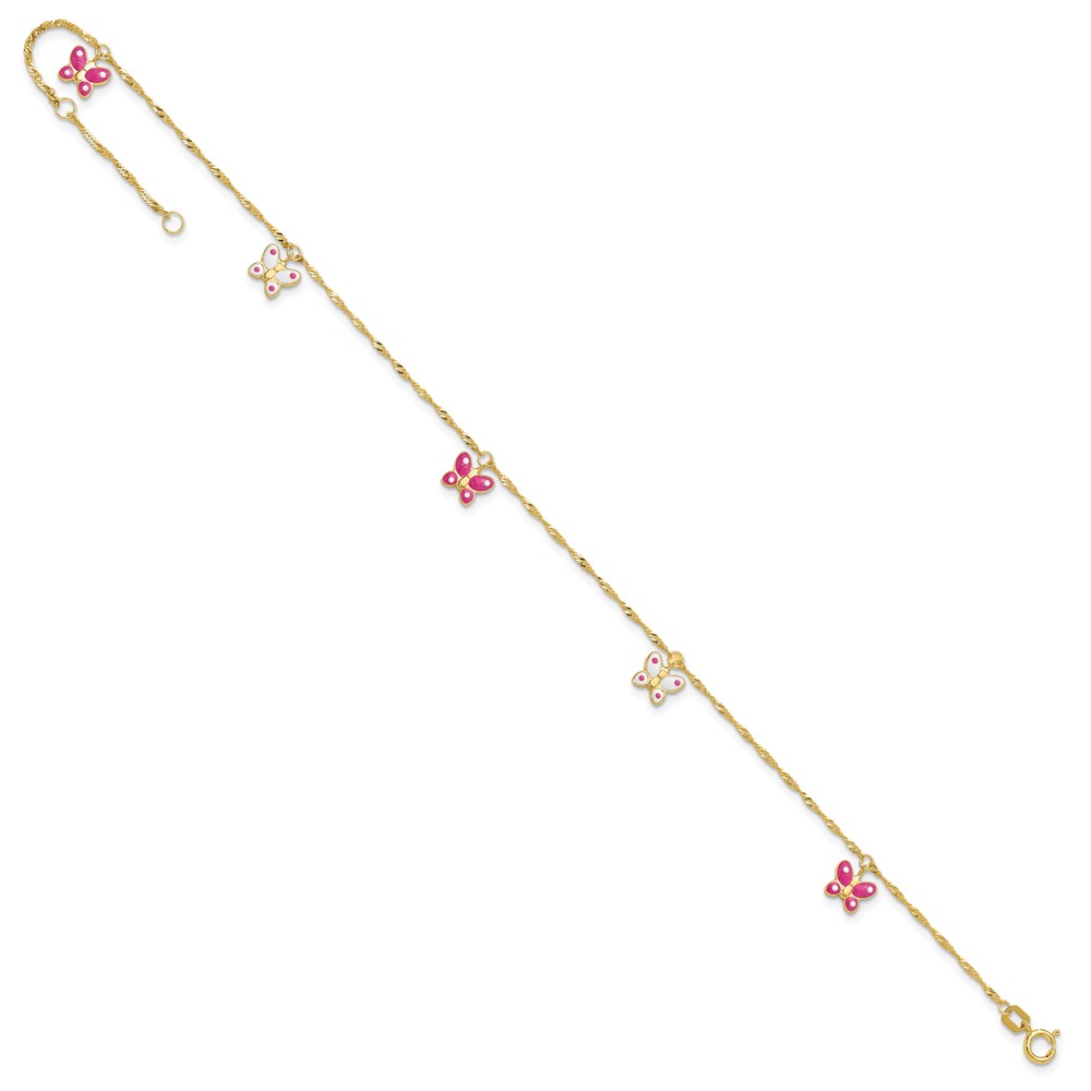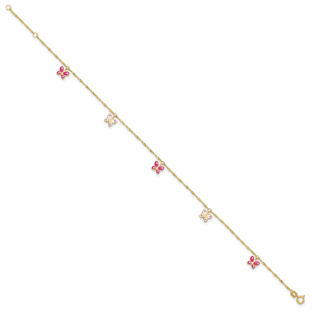 14k Pink and White Enameled Butterfly Dangles 9 inch Plus 1 inch Extender - Total 10 inch Anklet