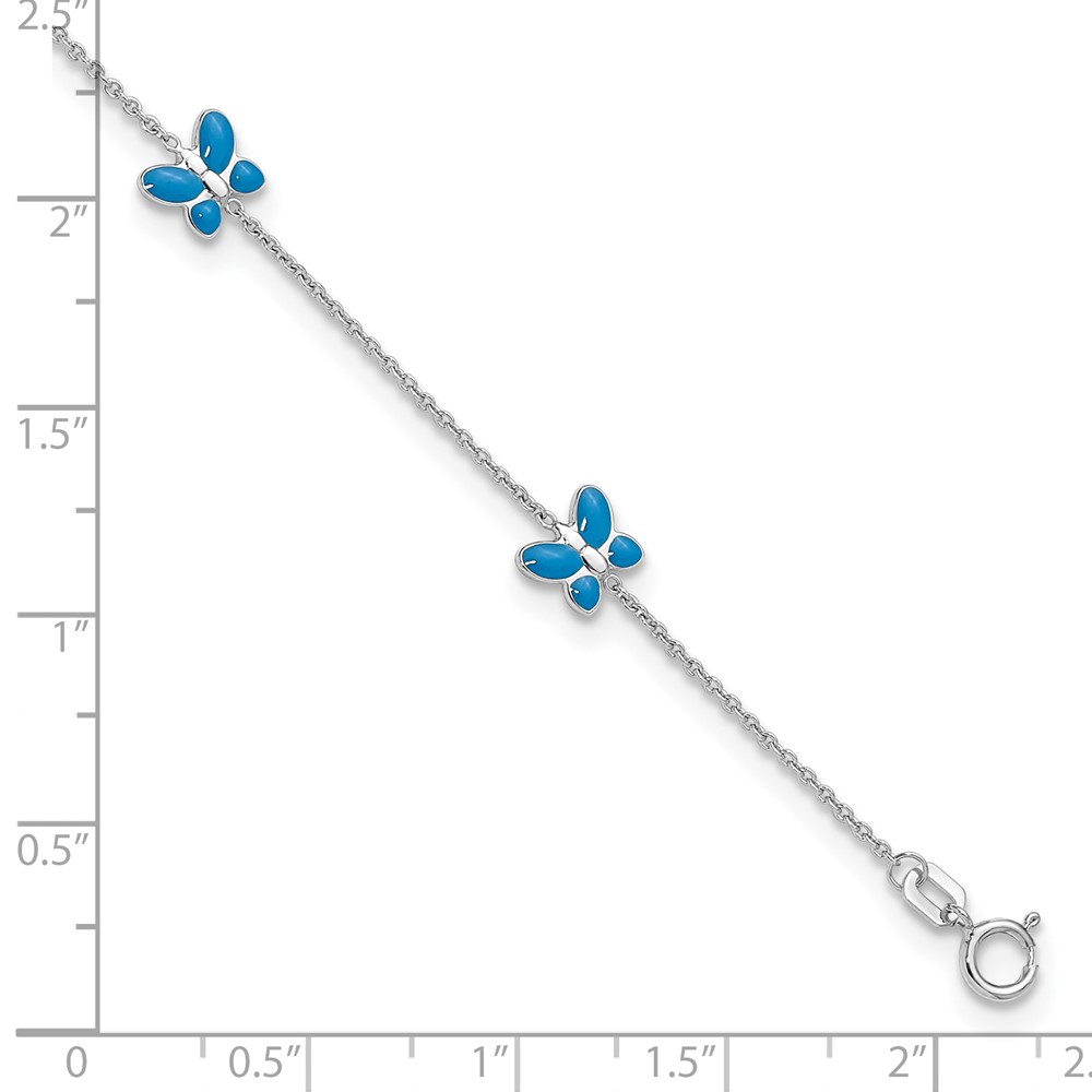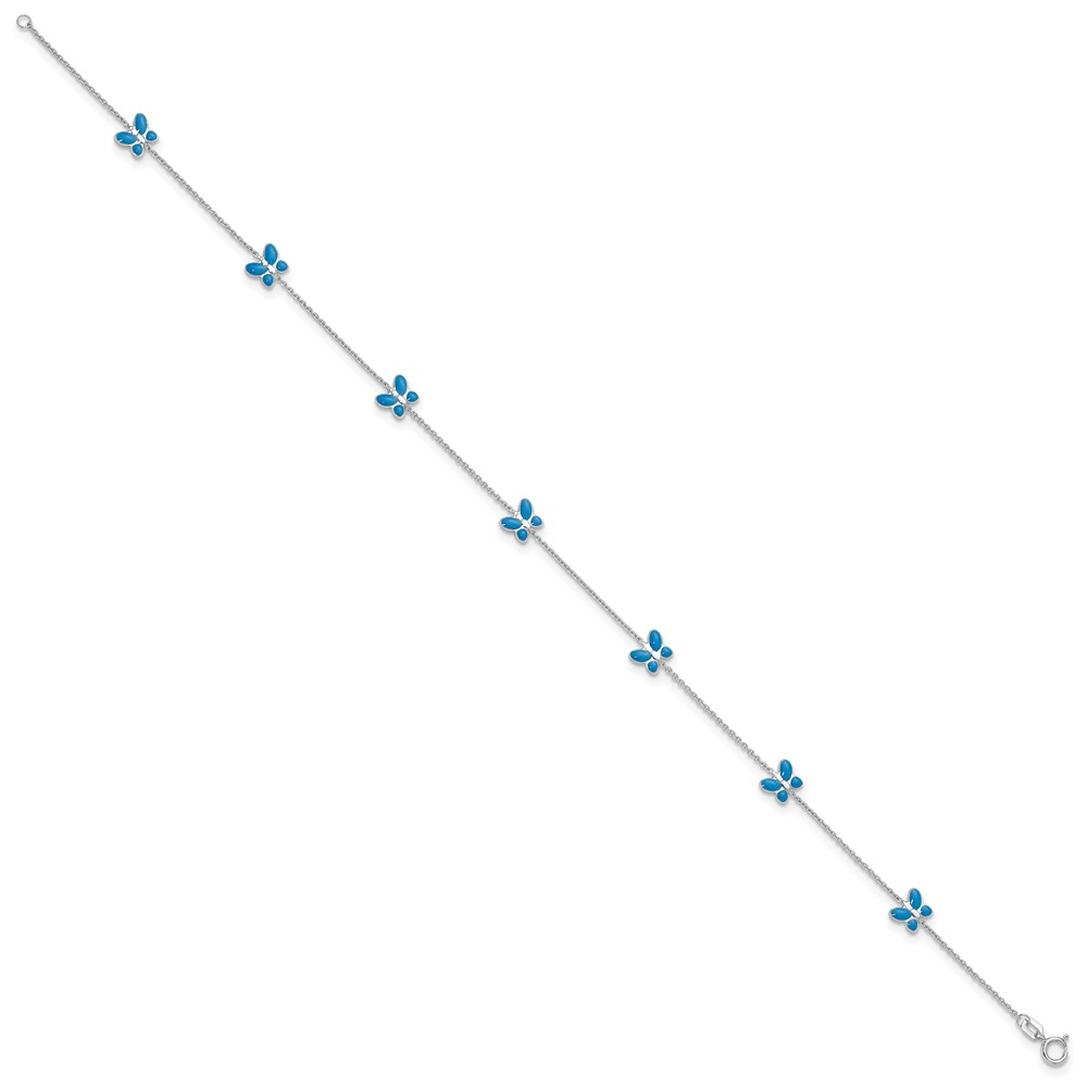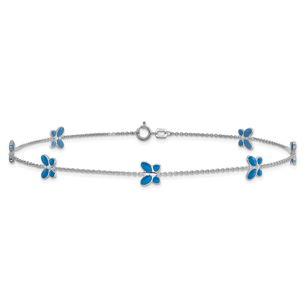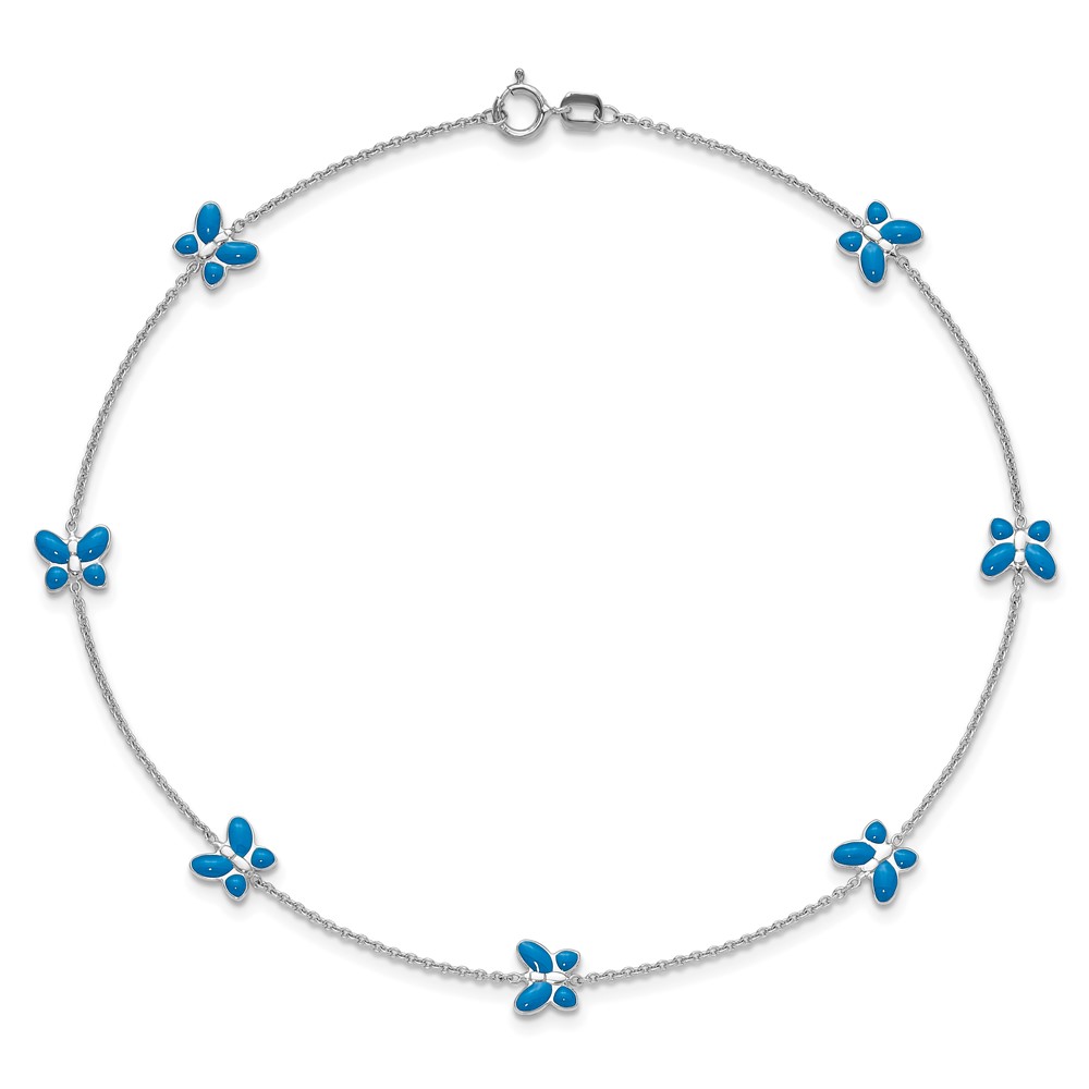 14k White Gold Blue Enameled Butterflies 7-Station 10 inch Anklet