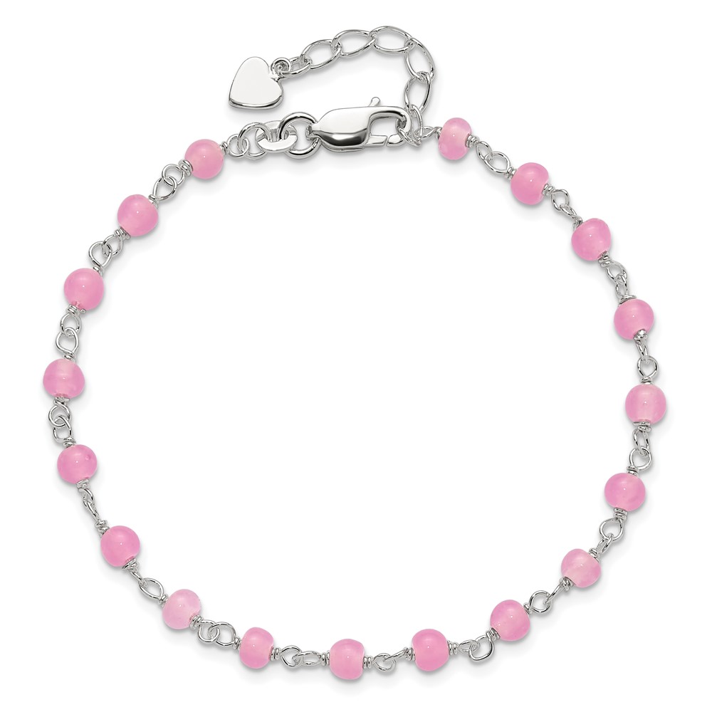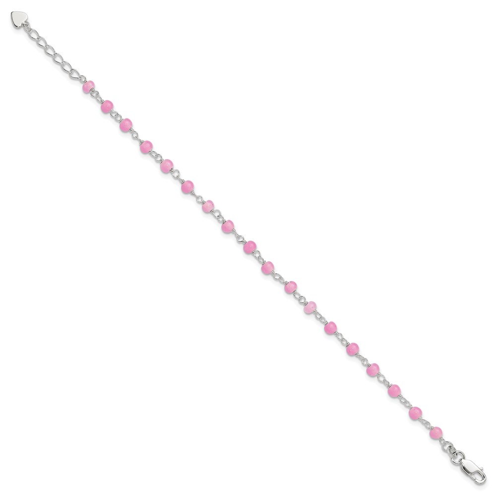 Sterling Silver Pink Glass Bead with Heart Dangle 8 inch Plus 1 inch Extender - Total 9 inch Anklet