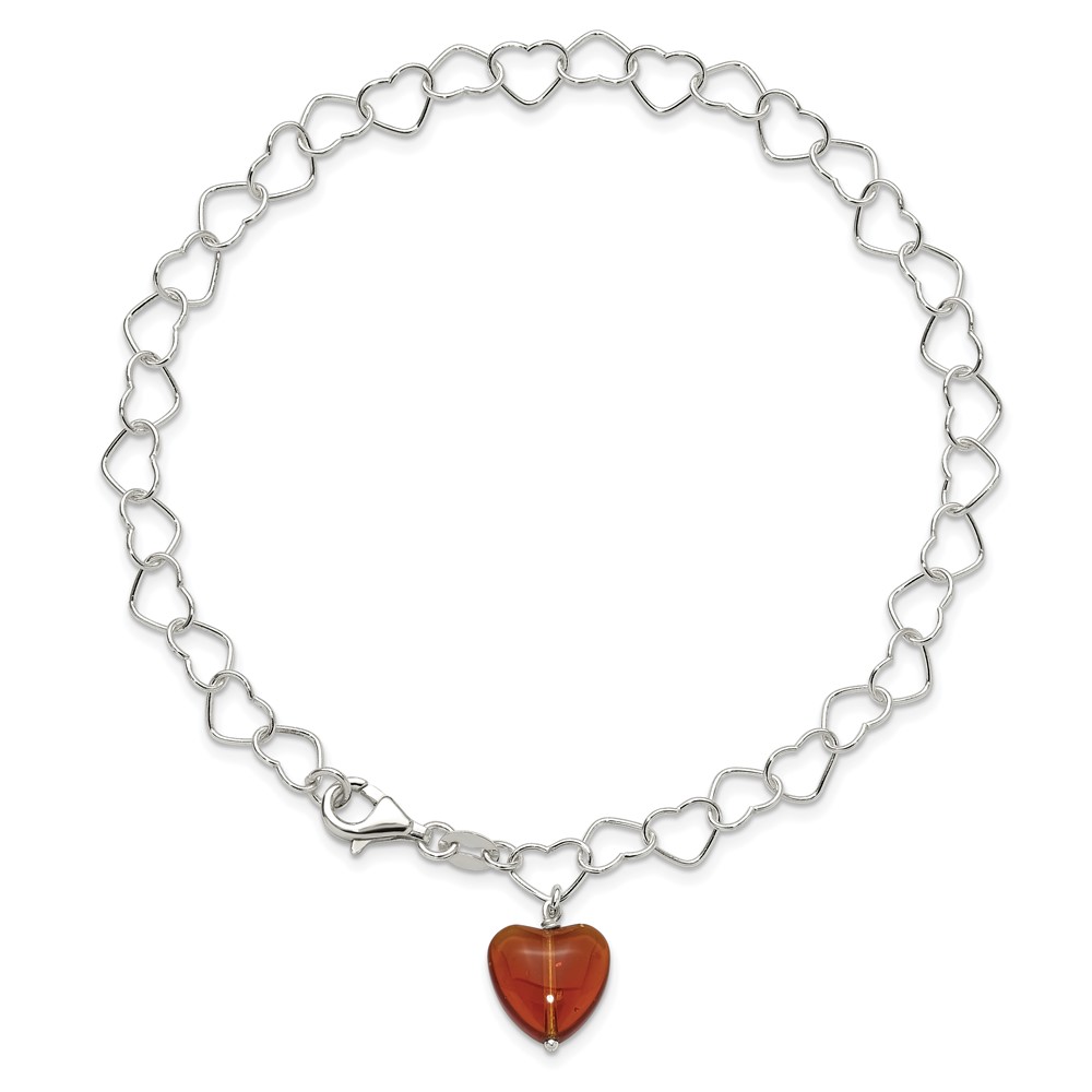 Sterling Silver Link Red Synthetic Crystal Stone Heart Anklet
