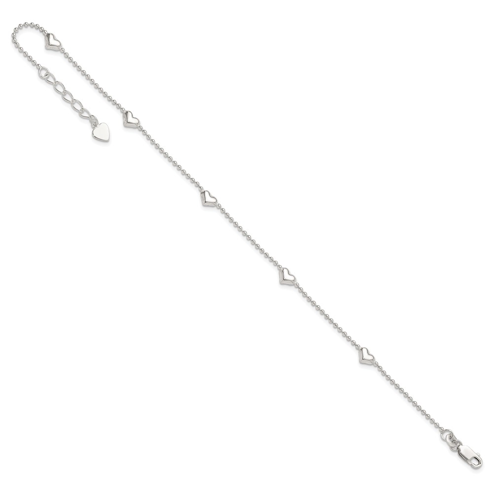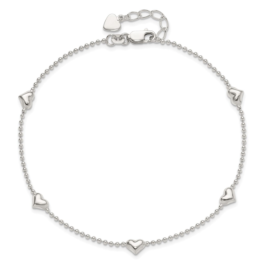 Sterling Silver Puffed Heart 5-Station 9 inch Plus 1 inch Extender - Total 10 inch Anklet