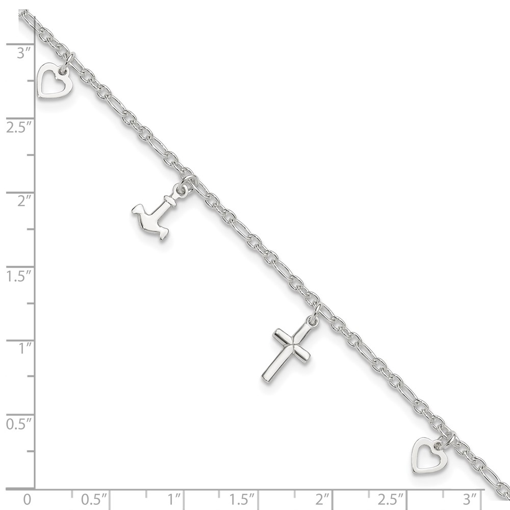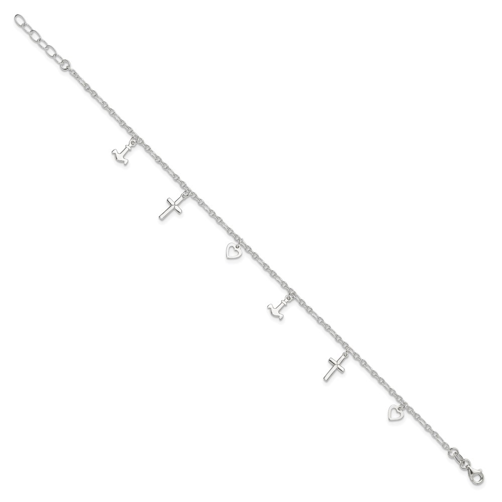 Sterling Silver Cross/Heart/Anchor 9 inch Plus 1 inch Extender - Total 10 inch Anklet