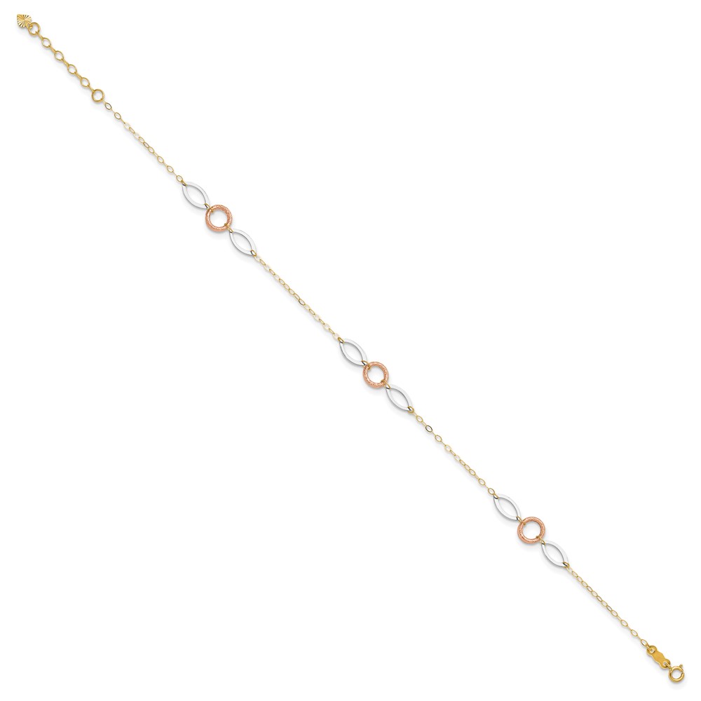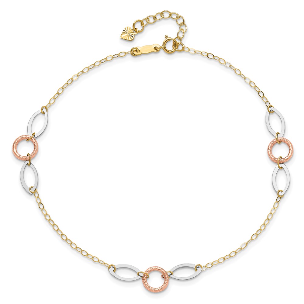 14k Tri-color Circle and Oval 3-Station 9 inch Plus 1 inch Extender - Total 10 inch Anklet